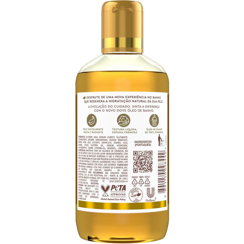 Desfrute de uma nova experiência no banho, que não apenas limpa, mas também regenera a hidratação natural da pele. Sinta a diferença do novo Dove Óleo de Banho e transforme seu ritual de cuidados diários. O segredo para uma pele bonita é a hidratação contínua e com Dove Óleo de Banho, sua pele fica visivelmente macia, radiante e nutrida. Nosso Sabonete Líquido Óleo de Banho Glicerinado contém 96% de ingredientes de origem natural, garantindo hidratação intensa, limpeza delicada e uma sensação de bem-estar após o banho. Sua fórmula suave e nutritiva limpa ao mesmo tempo em que hidrata, deixando a pele com toque sedoso e aveludado. Além disso, o Dove Óleo de Banho conta com uma textura líquida, que forma uma espuma cremosa e proporciona uma experiência envolvente, além de ser de fácil enxágue e não deixar sensação oleosa. Sua fragrância leve e sofisticada oferece uma verdadeira experiência de spa em casa e perdura na pele ao longo do dia, tornando o banho um momento de autocuidado e relaxamento premium. Para uma experiência ainda mais completa, sugerimos o seguinte modo de uso: aplique uma pequena quantidade na mão ou em uma esponja, espalhe suavemente pelo corpo até formar espuma, massageie e enxágue com água morna. Uso externo. Dove Óleo de Banho pode ser usado diariamente no corpo, mãos e rosto. Descubra um novo jeito de cuidar da pele com Dove Óleo de Banho.
