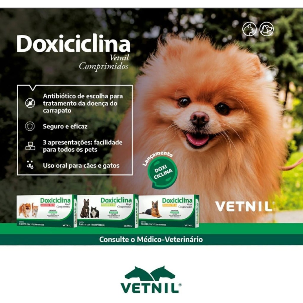 Descrição: Doxiciclina Vetnil Comprimidos Tratamento de infecções em cães e gatos. PROPRIEDADES: A doxiciclina é um antibiótico altamente lipofílico da classe das tetraciclinas, apresentando maior distribuição entre os tecidos e facilitando a posologia para uso. A despeito de ser o principal fármaco para tratamento da erliquiose, a doxiciclina é altamente eficaz contra diversas outras bactérias, incluindo algumas cepas de Staphylococcus. Possui atividade bacteriostática de amplo espectro, atuando por meio da inibição da síntese proteica dos microrganismos sensíveis pela ligação reversível às subunidades 30S do ribossomo, o que impede que o RNA-transportador (RNAt) se fixe ao ribossomo. Assim, prejudica o metabolismo bacteriano de forma efetiva. INDICAÇÃO Doxiciclina Vetnil Comprimidos é um antibiótico do grupo das tetraciclinas, sendo seu princípio ativo a medicação de escolha para o tratamento da erliquiose canina, doença transmitida pelo carrapato, causada normalmente pela Ehrlichia canis. O produto também é indicado para cães e gatos no tratamento de infecções causadas pelas bactérias sensíveis: Cães (dose de 5 mg/kg): Staphylococcus aureus, Staphylococcus pseudointermedius, Staphylococcus intermedius, Bordetella bronchiseptica, Corynebacterium auriscanis e Streptococcus canis; Cães (dose de 10 mg/kg): Staphylococcus aureus, Staphylococcus pseudointermedius, Staphylococcus intermedius, Bordetella bronchiseptica, Corynebacterium auriscanis, Enterococcus faecalis, Streptococcus canis e Pasteurela multocida; Gatos: Staphylococcus aureus, Staphylococcus pseudointermedius, Staphylococcus intermedius, Bordetella bronchiseptica, Corynebacterium auriscanis, Enterococcus faecalis, Streptococcus canis e Pasteurela multocida. _____________________________________________________________ A MANADA ANIMAL é um marketplace de produtos veterinários. É a escolha certa para tutores que prezam pela qualidade dos produtos que seu animal necessita. Tudo com o suporte de uma equipe de veterinários e gestores com mais de 10 anos de experiência no mercado. Fique tranquilo, todos os nossos produtos são originais, adquiridos através de distribuidores credenciados! Ah, e todas as vendas acompanham nota fiscal! MANADA ANIMAL, Tranquilidade pra você, cuidado para ele!