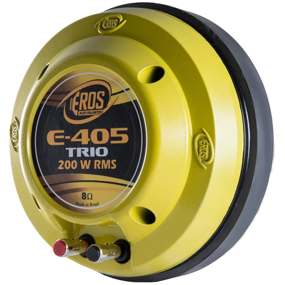 A Eros alto falantes apresenta mais uma novidade para o mercado de som automotivo: o Driver Eros E-405 Trio 200 RMS Fenólico 8 Ohms. O modelo possui valor em RMS nominal de 200 RMS. A novidade fica por conta da nova carcaça em alumínio que permite melhor refrigeração, que agora é pintada em amarelo. O E-405 Trio agora possui uma resposta de frequência de mais ampla e maior eficiência. Com estas características, serve perfeitamente para quem quer elevada potência na região da voz e vai utilizá-lo juntamente com um super tweeter o drivers de titânio. Características: • Diâmetro da garganta: 50 mm • Potência RMS nominal: 200 RMS • Resposta de frequência: 390 a 9.400 Hz • Impedância nominal: 8 Ohms • Sensibilidade: 113 dB - SPL • Potência RMS: 200 Watts (potência obtida com crossover PASSIVO em 700 Hz) • Potência RMS: 132 Watts (potência obtida com crossover ATIVO em 700 Hz) • Diâmetro da bobina: 100 mm • Tampa em alumínio • Membrana fenólica • Terminais metálicos de alta pressão.