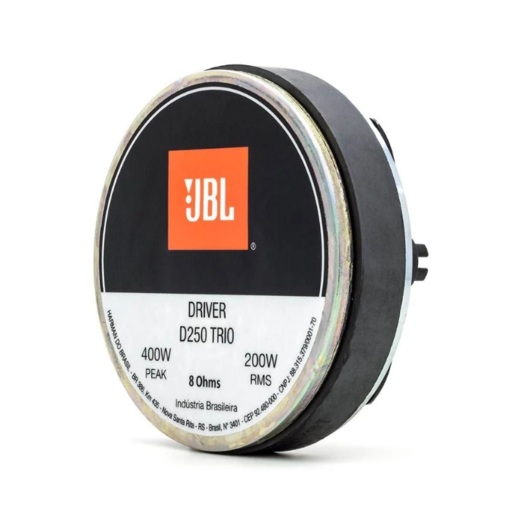 Se você quer dar aquela boa incrementada nas frequências médias do seu sistema de som, o Driver D250 TRIO da JBL é uma boa pedida, afinal ele é super robusto, tem muita eficiência e oferece alta sensibilidade com baixíssima distorção. ESPECIFICAÇÕES TÉCNICAS: • Impedância: 8 Ohms • Potência RMS: 200 W • Potência de Programa Musical (PMPO): 400W • Diafragma Fenólico • Sensibilidade em Corneta: 106 dB SPL • Resposta de Frequência @ -10 dB: 400 a 4.000 Hz • Diâmetro da Garganta: 25 mm • Diâmetro da Bobina: 51 mm • Re (Resistência da Bobina): 6,0 Ohms • Densidade de Fluxo no Gap: 1,10 T • Frequência de Corte Mínima Recomendada (12 dB / oit): 1.000 Hz • Material do Ímã: Ferrite de Bário • Diâmetro x Altura do Ímã: 135 x 20 mm • Material da Base e Tampa: Alumínio • Acabamento da Base e Tampa: Pintura Epóxi, Cor Preta Texturizada • Acabamento das Arruelas: Cromatização Azul • Material do Fio da Bobina: Cobre • Material da Fôrma da Bobina: Poliimida (Kapton ) • Comprimento do Fio da Bobina: 8,7 m • Altura do Enrolamento da Bobina: 6,0 mm • Coeficiente de Temperatura do Fio (a25): 0,00404 1/°C • Volume Ocupado pelo Falante: 0,7 l • Qualidade Reconhecida da Antiga Selenium • Dimensões Aproximadas (DxP): 13,5 x 8,5cm CONTEÚDO DA EMBALAGEM • 1 Driver • Manual e Certificado de Garantia Atenção: Conforme Lei Federal nº 11.291, a exposição prolongada a ruídos superiores a 85 dB pode causar danos ao sistema auditivo.