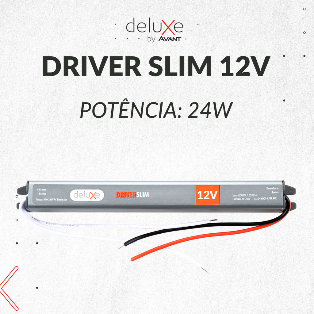 O Driver Slim é uma solução compacta e eficiente para alimentar equipamentos de 12V, com potências de 18W a 72W. Sua construção robusta e design moderno o tornam ideal para diversos projetos. * Características: - Bivolt Automático: Funciona em 100V-240V, adaptando-se a qualquer tomada. - Baixo Consumo de Energia: Eficiência energética para redução de custos. - Classe I: Alta segurança para o usuário. - Fator de Potência 0,5: Melhor desempenho e economia de energia. - Potências: 18w, 24W, 36W, 48W, 60W, 72W. - Material Resistente: Alumínio e plástico garantem durabilidade e resistência. - IP20: Proteção contra poeira e objetos sólidos. * Especificações Técnicas: Tensão de Entrada: 100V e 240V Tensão de Saída: 12V Corrente de Saída: Varia conforme a potência do Driver * Aplicações: - Iluminação LED (fitas, painéis, luminárias) - Sistemas eletrônicos - Equipamentos de 12V * Benefícios: - Eficiência e economia de energia - Facilidade de instalação - Segurança e confiabilidade - Design compacto e moderno * Garantia: 2 Anos de garantia oficial Avant