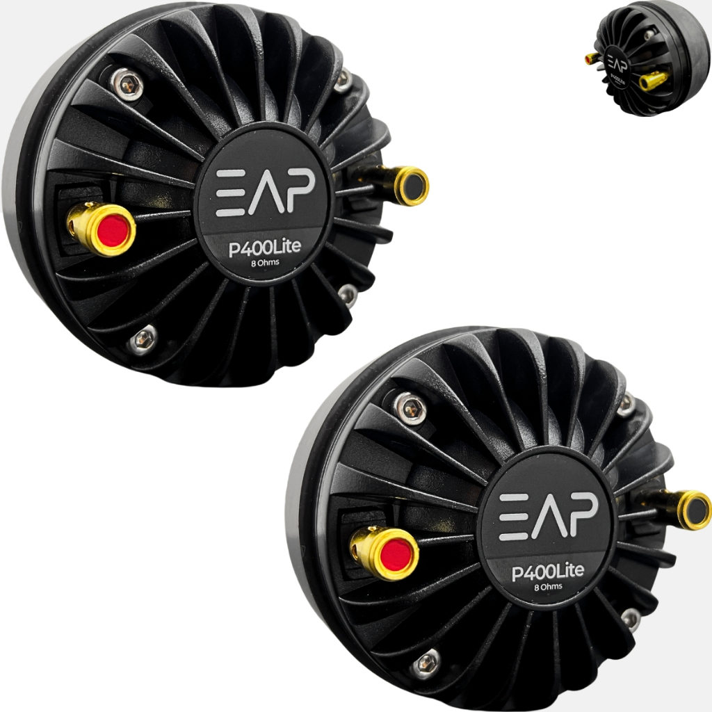 Especialmente desenvolvido para reproducao de medias e altas frequencias, o Driver EAP P400 Lite e um driver de compressao indicado para a utilizacao em sistemas de audio que exigem alta qualidade, melhor sonoridade e maior resistencia. Exclusivo diafragma em Poliimida Perolizada (PearlDome R), evidenciando alta sensibilidade, baixa distorcao e alta resistencia, garantindo timbres perfeitos, livres dos indesejados metalizados estridentes e sem danos mecanicos. Poderoso conjunto magnetico projetado em software FEM (Finite Element Method) para obter 17.000 Gauss (1.7T), usinado com altissima precisao, garante qualidade e repetibilidade, com pintura KTL (eletrodeposicao catodica) garantindo excelente protecao anticorrosiva, sendo um processo eficiente que proporciona uma resistencia superior a 1.000 horas em testes Salt-Spray. Sua bobina movel e fabricada com fio CCAR (Copper Clad Aluminum Ribbon), enrolada em forma de KaptonR, obtendo-se grande estabilidade e resistencia termica. Acompanha adaptador flange/rosca exclusivo EAP com geometria otimizada para reducao de ondas estacionarias na garganta Impedancia Nominal:_______________________________8? RE (Resistencia Nominal): ___________________________6.3? Sensibilidade (1W/1m) :____________________110.42 dBSPL 4 Diametro da Garganta:___________________________25mm Potencia RMS AES (Crossover 1500hz @ 24db/8a): ____80W 2 Potencia de Programa (Crossover 1.5Khz@ 24db/8a):__160W 2 Resposta de Frequencia:________________920hz a 18.000hz 3 Diametro da Bobin:_____________________________44mm Material do fio:_____________Copper Clad Aluminum Ribbon Corpo da Bobina:_______________________________KaptonR Indutancia da Bobina:_________________________389,75uH Material do Diafragma:________________________PearlDome Densidade de fluxo Magnetico no GAP:____________1,7 Tesla Material do ima: Ferrite de Bario Diametro x Altura do ima: 90mm x 20mm Profundidade: 60mm Polaridade: Tensao + no borne vermelho: deslocamento do diafragma na direcao inversa da garganta. Peso Liquido: 1,26 Kg Peso Bruto com embalagem: 1,3 kg Furos para Fixacao: Padrao 4 furos Dimensoes da Embalagem: 6,5cm x 10,5cm x 9,5cm Conteudo da Embalagem: 2 x Driver EAP P400 LITE Kit com parafusos e porcas de fixacao 2 IMPORTANTE: - Valor Referente a 2 unidades - Imagens ilustrativas - Garantia de 6 meses - Recomendamos que a instalacao seja feita por um profissional, e nao responsabilizamos pelo mau uso do produto.