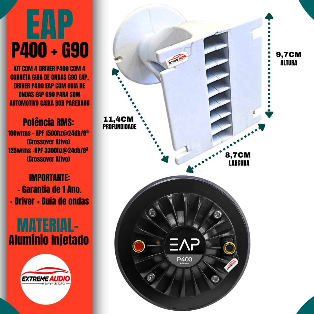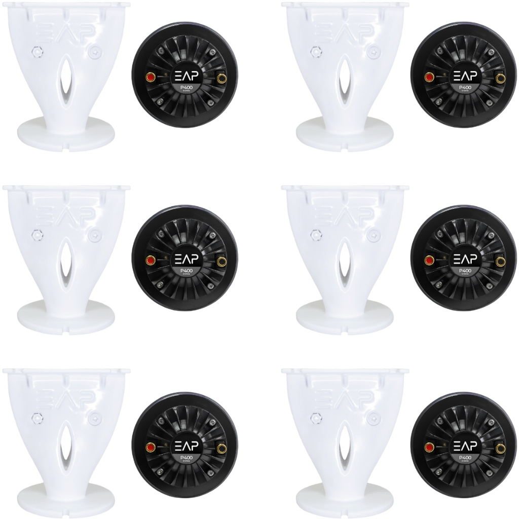 Este KIt e composto por 6 Drivers EAP Poliimida Ferrite P400 8 Ohms Com 6 Guias de Ondas EAP G90 Especialmente desenvolvido para reproducao de medias e altas frequencias, o Driver EAP P400 e indicado para a utilizacao em sistemas com 2, 3 ou 4 vias (com ou sem drivers fenolicos), quando se busca melhor sonoridade e maior resistencia, livre de timbres metalizados caracteriscos do diafragma de titanio. Tem efetiva resposta a partir de 1500hz com crossover ATIVO HPF 1500hz 24db/8a (nao passivo como outras marcas prometem) Com o diafragma de domo em Poliimida Pearl Dome R, que lhe propicia alta sensibilidade, baixa distorcao e alta confiabilidade mesmo em frequencias abaixo de 2khz. Sua bobina movel e fabricada com fio de CCAR (Copper Clad Aluminum Ribbon), enrolada em forma de Kapton, obtendo-se grande estabilidade e resistencia termica. Potencia RMS: 100wrms - HPF 1500hz@24db/8a (Crossover Ativo) 125wrms -HPF 3300hz@24db/8a (Crossover Ativo) ESPECIFICACOPES TECNICAS: Diametro da Garganta: 1' (25mm) Impedancia Nominal: 8Ohms RE: 6.2Ohms Potencia AES: 100W rms - HPF 1500hz@24db/8a (Crossover Ativo) Programa Musical: 200W - HPF 1500hz@24db/8a (Crossover Ativo) Crossover Min. Recomendado: 1500Hz (24dB/oct) Sensibilidade: 111 dB SPL (1W/M) Resposta em Frequencia: 1000Hz a 20KHz @ -8dB Diametro de Bobina Movel: 44,4mm Material do Corpo da Bobina: Polymide (Kapton) Material do Fio da Bobina: CCAR (Copper Clad Aluminum Ribbon) Material do Diafragma: Poliimida Pearl DomeR Material Magnetico: Ferrite Material da Tampa: ABS Injetado - Dimensoes: 115mm x 60mm - Peso Liquido: 1,88kg Para a utilizalcao do G90 com drivers de rosca, e necessario a utilizacao de um adaptador de rosca para flange. Especificacoes Tecnicas DA GUIA DE ONDAS G90 Range de frequencia:1,1khz a 20Khz Corte de Frequencia Recomeendado: 1.5 khz Cobertura Nominal Horizontal -3db : 120 graus Cobertura Nominal Vertical -3db : 65 graus Dimensoes Comprimento: 114,34mm Largura: 90mm Altura: 97,2mm Peso Bruto: 0,56 kg Peso Liquido: 0,49 kg Material : Aluminio Injetado IMPORTANTE: - Garantia de 1 Ano. - 6 Drivers+ 6 Guias de ondas - Imagens Meramente Ilustrativas. - Recomendamos que a instalacao seja feita por profissional especializado e nao nos responsabilizamos pelo mau uso do produto.