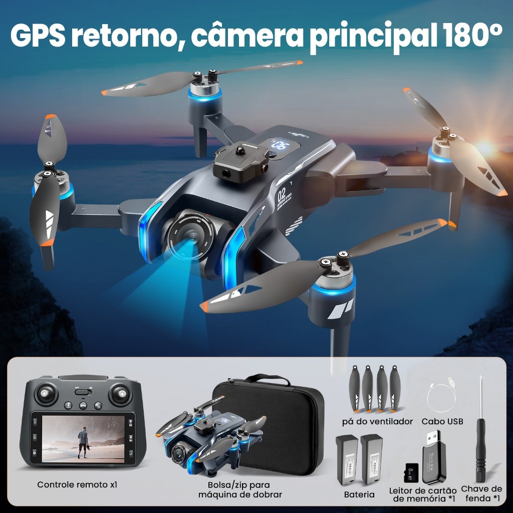 DRONE PROFISSIONAL COM TELA 4.5" E GPS - Câmera principal 180° em alta definição, motores sem escovas e transmissão 5G. Peso apenas 227g - ISENTO DE REGISTRO na maioria dos países. Ideal para fotografia aérea profissional e hobby! Inclui bolsa de transporte e acessórios completos. 🔧 Produto: Cor: Azul escuro Dimensões abertas: 233×268×65mm Dimensões dobradas: 146×120×65mm Material: Plástico, metal, componentes eletrônicos Idade recomendada: 14+ anos 📡 Transmissão: Frequência: 5G antena única Canais: 4 canais + giroscópio de 6 eixos Alcance do controle: 500 metros Tela do controle: 4.5 polegadas 🔋 Bateria e Motor: Bateria do drone: 7.4V 1300mAh (até 20min de voo) Tempo de carga: 120 minutos Motor: 1503 sem escovas 2100KV Bateria do controle: 3.7V 1200mAh 📷 Câmera: Resolução: 4K Ângulo da câmera: 180° ajustável Estabilização: EIS eletrônica Transmissão de imagem: Até 300 metros 🎯 Cenários de Uso Prático: 🎥 Fotografia Aérea: Imagens profissionais de paisagens e eventos 🏠 Monitoramento: Inspeção de propriedades e áreas ✈️ Viagens: Registro de momentos especiais em viagens 📱 Conteúdo Digital: Criação de material para redes sociais 🎯 Hobby: Diversão e aprendizado de pilotagem 📦 Acessórios Incluídos: 1× Drone dobrável 1× Controle remoto com tela 4.5" 2× Bateria 7.4V 1300mAh 8× Hélices de reserva 1× Cartão de memória 1× Leitor de cartões 1× Cabo USB 1× Chave de fenda 2× Manuais de instrução 1× Bolsa de transporte 🚀 Funcionalidades Destacadas: ✅ GPS Preciso: Retorno automático por baixa bateria/sinal ✅ Evitação de Obstáculos: Para maior segurança ✅ Controle Inteligente: Seguimento automático e rotas personalizadas ✅ Câmera 180°: Ângulos amplos para captura completa ✅ Tela 4.5": Visualização em tempo real de alta qualidade