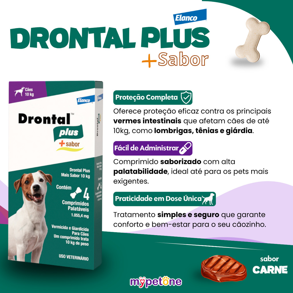 Drontal Plus Tasty Dog 10 kg - 4 Comprimidos O Drontal Plus Tasty Dogs é um antiparasitário de amplo espectro, mastigável e sabor carne, indicado para cães. Combate eficazmente vermes intestinais como tênias, lombrigas, ancilostomídeos e tricurídeos, em dose única. Composição por comprimido: - Praziquantel - eficaz contra tênias. - Pyrantel pamoato - combate ancilostomídeos e ascarídeos. - Febantel - age contra tricurídeos. Indicação: Para cães pesando cerca de 10 kg - dose: 2 comprimidos (1 comprimido para cada 5 kg de peso), administrados uma única vez. Modo de uso: - Pode ser oferecido diretamente, disfarçado na ração ou misturado a petiscos. - Não é necessário jejum antes ou depois da administração. - Recomendado repetir a dose a cada 12 semanas, conforme orientação veterinária. Benefícios: - Proteção completa contra os principais vermes intestinais. - Comprimido saborizado atrativo, facilitando a aceitação. - Dose prática e única, garantindo conforto para o animal. Precauções: - Use apenas sob orientação veterinária. - Não aplicar em cães com menos de 2 semanas de vida. - Evitar uso em fêmeas gestantes sem consulta prévia. - Armazenar ao abrigo da luz e calor. Drontal Plus Tasty - dose prática para cães de 10 kg: 4 comprimidos.