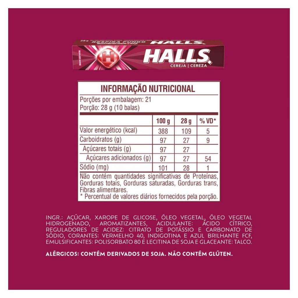 Halls é bala mais consumida do Brasil! Sua formulação possui mentol, que garante uma poderosa sensação de refrescância e respiração profunda, para você se sentir pronto para encarar qualquer desafio. Disponível em deliciosos sabores, Halls é a bala perfeita para o dia-a-dia e também para momentos de curtição com a galera. Sua embalagem é prática e fácil de carregar no bolso ou na mochila, para ter Halls sempre com você! ALÉRGICOS: CONTÉM DERIVADOS DE SOJA E PODE CONTER DERIVADO DE LEITE. Informações Nutricionais Porção de 20g - 7 unidades Valor Energético 77kcal (4%) Carboidratos 19g (6%) Açúcares 13g (**) Sódio 27mg (0%)
