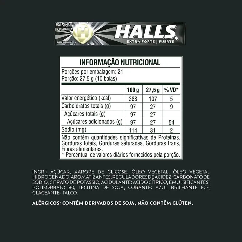 Halls é bala mais consumida do Brasil! Sua formulação possui mentol, que garante uma poderosa sensação de refrescância e respiração profunda, para você se sentir pronto para encarar qualquer desafio. Disponível em deliciosos sabores, Halls é a bala perfeita para o dia-a-dia e também para momentos de curtição com a galera. Sua embalagem é prática e fácil de carregar no bolso ou na mochila, para ter Halls sempre com você! ALÉRGICOS: CONTÉM DERIVADOS DE SOJA E PODE CONTER DERIVADO DE LEITE. Informações Nutricionais Porção de 20g - 7 unidades Valor Energético 77kcal (4%) Carboidratos 19g (6%) Açúcares 13g (**) Sódio 27mg (0%)