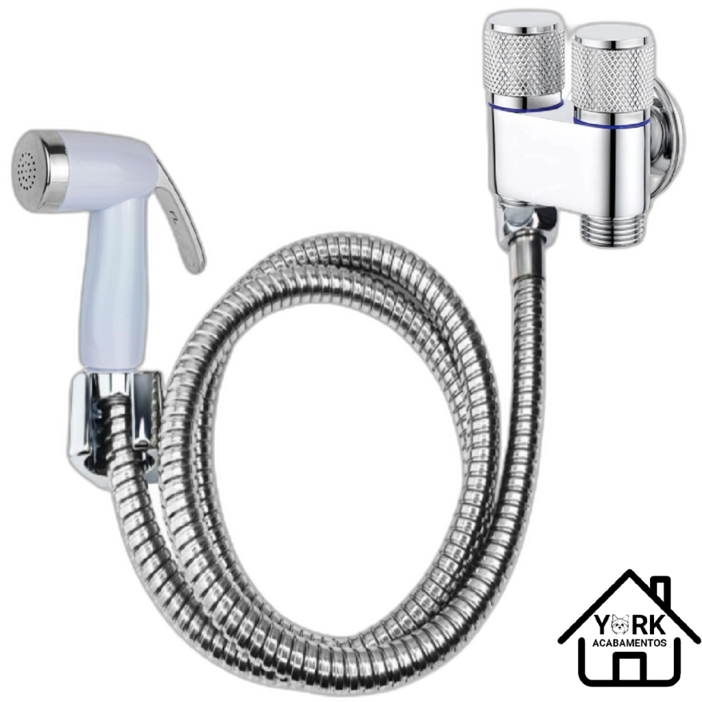 Ducha Higiênica com Gatilho Branco Cromado + Mangueira Inox Flexível e Registro Dupla Saída de Água