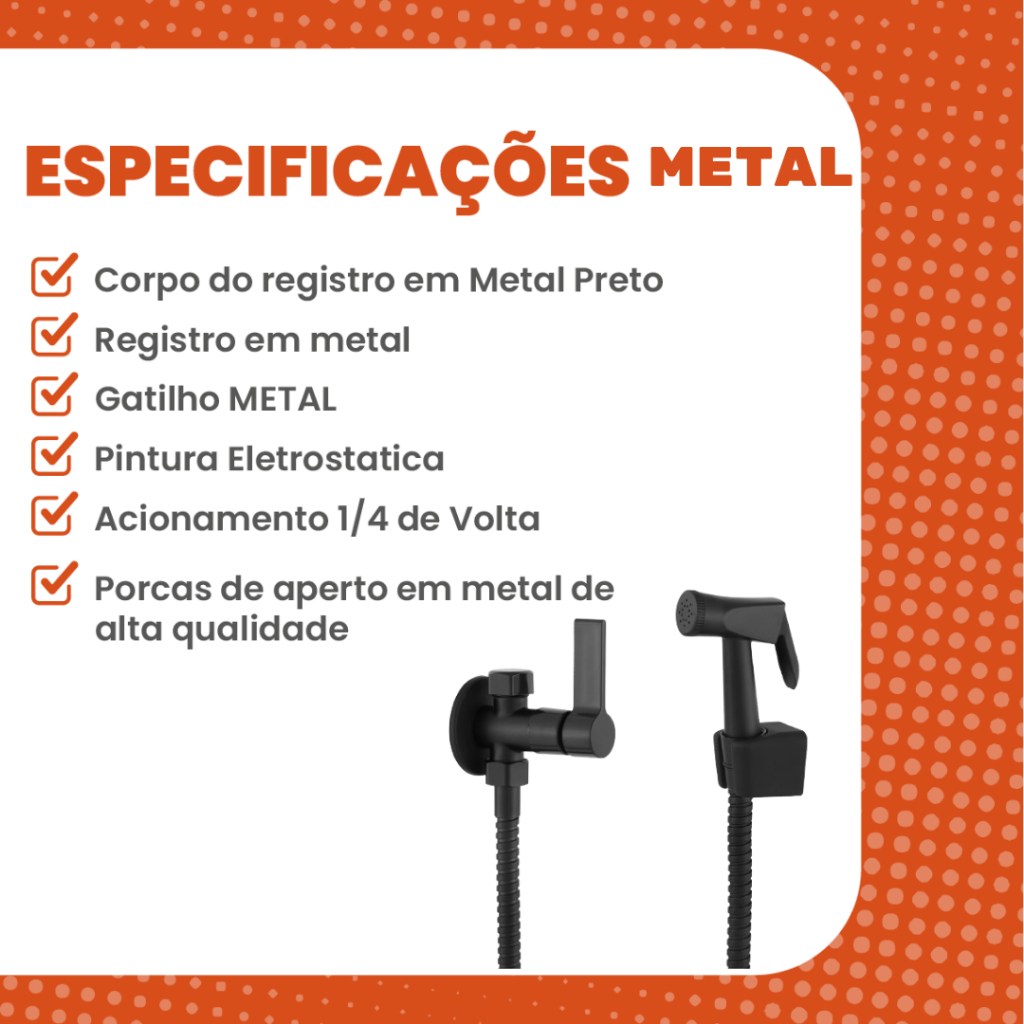 Olá, Seja Bem Vindo a Loja Kasa.com ------------------------------------------------------------------------------------------------------------------- ENVIO RÁPIDO E PRODUTOS A PRONTA ENTREGA!!! ------------------------------------------------------------------------------------------------------------------- Ducha Higiênica Luxo Com Desviador. COMPLETA, só instalar e usar! - Produto Fabricado em Metal com opçao de escolher o gatilho Gatilho Metal Preto Gatilho ABS Preto - Entrada: 1/2" - - Sempre que não estiver utilizando a Ducha deixar o registro FECHADO, para a mangueira não estragar - Corpo do registro em Metal Preto ! - Produto completa, só instalar e usar - Registro em metal com mecanismo cerâmico 1/4 de volta - Mangueira flexível360 com 1,20 mts em INOX Preto com porcas em metal. - Porcas de aperto em metal de alta qualidade -PRODUTO ELEGANTE E FORTE