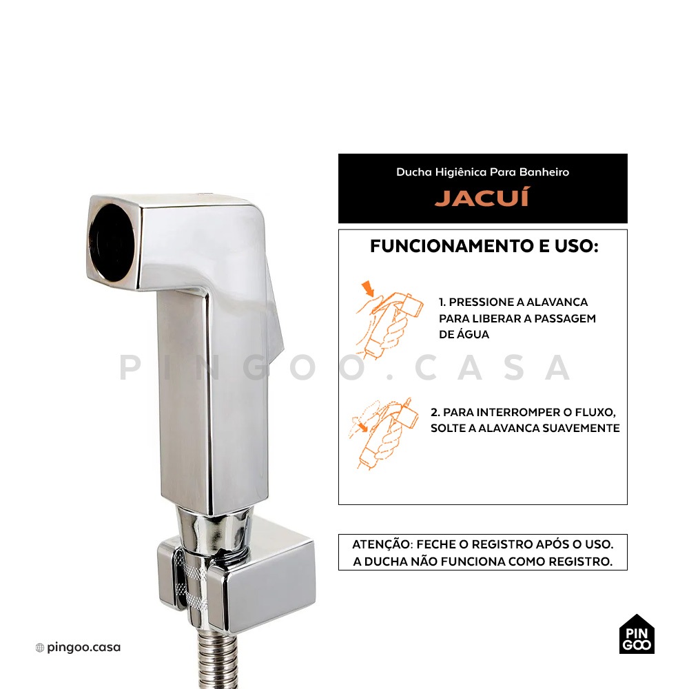 Deixe o seu ambiente mais sofisticado e moderno com o Kit da Pingoo, pensado cuidadosamente para trazer mais charme e praticidade ao seu lar. O seu banho será transformado com a Ducha Higiênica Jacuí da Pingoo, concebida para proporcionar uma sensação inigualável de conforto e prazer, enquanto adiciona um toque extra de elegância e contemporaneidade ao seu ambiente interno ou externo. O seu design ultra fino e quadrado não é apenas um deleite para os olhos, mas é garantia de um desempenho impecável sob condições de baixa e alta pressão, sendo adequado para qualquer sistema de aquecimento. Este item não é elétrico, mas é uma joia em termos de funcionalidade e estética, ideal para ser o destaque no banheiro dos seus sonhos. O Acabamento Mearim, também da Pingoo, é outra peça que fala por si mesma. Podendo ser utilizado tanto em registros de pressão quanto de gaveta, este acabamento na cor prata é sinônimo de sofisticação e praticidade. Seu sistema de abertura de água funciona harmoniosamente com o mecanismo do seu registro padrão Deca, promovendo facilidade no manuseio diário e uma instalação sem transtornos. Atenção: Feche o registro da ducha higiênica após o uso. Seu gatilho não faz a função de registro. Especificações Gerais do Kit: Marca: Pingoo Acabamento: Cromo Triplo (Ducha) / Cromado (Acabamento Mearim) Material Predominante: Metal, com detalhes em ABS (Ducha) / Metal (Acabamento Mearim) Dimensões: Verificar última imagem do anúncio Itens Inclusos no Kit: 1 Suporte de parede 1 Ducha Higiênica Jacuí 1 Registro 1 Mangueira 1 Acabamento de Registro Mearin - Prata