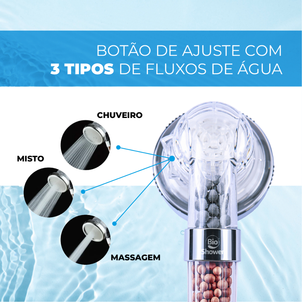 Ducha Bio Shower® Pure Hair - COMPLETA!!! (Já acompanha os minerais). - Botão de regulagem p/ 3 modos de Jatos (Chuveirinho, massagem e misto) 200% a mais de pressão com 50% menos consumo de água. A Ação dos minerais: Esferas minerais infravermelho que atuam no processo de filtragem e purificação da água. Ânions transformam as moléculas de água em partículas de fácil absorção promovendo a melhora do metabolismo celular. BENEFÍCIOS O QUE AS ESFERAS DE ÂNION PODEM FAZER? Bioativos que ajudam a regular as glândulas de oleosidade. As esferas minerais removem, cloro, flúor, toxinas que causam processos alérgicos a pele. Promove a balanceamento do pH, removendo metais pesados, bactérias e odor. Proporciona uma pele mais macia e saudável com aumento da viabilidade celular. CABELO MAIS MACIO JÁ NO PRIMEIRO BANHO As pedras bioativas removem mais de 30 substâncias que danificam e ressecam o cabelo. Enquanto retira o cloro as esferas liberam íons promovendo limpeza profunda e hidratação. Diminui diretamente na “dureza” da água, melhorando a eficácia dos seus produtos preferidos para o cabelo. IDEAL PARA CABELOS COM TRATAMENTO QUÍMICO Duplo filtro de metais pesados atuam na prevenção de danos causados por esse contaminante. Diminui o efeito de ressecamento causados pela presença em excesso de cloro na água. Promove a balanceamento do pH, facilita a hidratação e aumenta o brilho. VEJA COMO TODO O PROCESSO ACONTECE Esferas minerais infravermelho que atuam no processo de filtragem e purificação da água. Ânions transformam as moléculas de água em partículas de fácil absorção promovendo a melhora do metabolismo celular. Instalação simples e pode ser instalado em qualquer lavatório. Passo 1: Retire sua ducha antiga. Passo 2: Enrosque no sentido horário sua nova ducha. Passo 3: Agora é só ligar a água e desfrutar de um banho purificante. Garantia do vendedor: 30 dias
