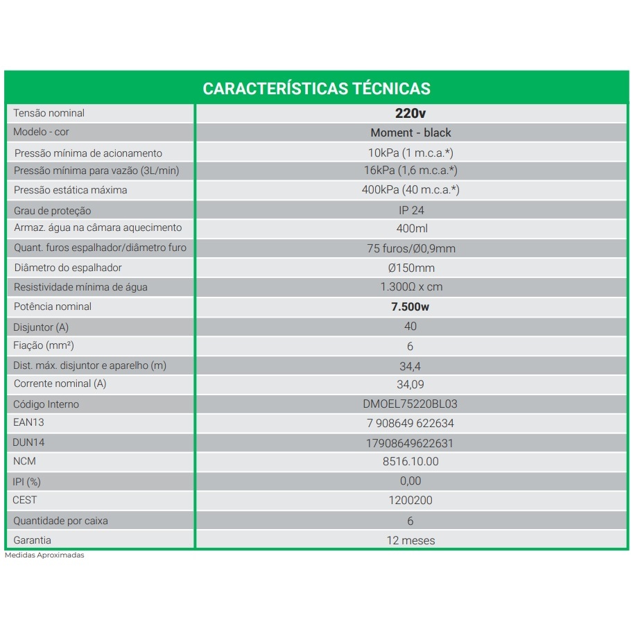 🚿 Ducha Eletrônica Moment Branca 220V 7500W – Zagonel Transforme seu banho em um momento único com a Ducha Eletrônica Moment da Zagonel. Design moderno, alta potência e tecnologia que garante conforto e segurança para toda a família. Principais Benefícios ✔ Controle eletrônico de temperatura – ajuste gradual e preciso ✔ Sistema de proteção contra choque ✔ Compatível com aquecimento solar ✔ Compatível com DR (Dispositivo Diferencial Residual) ✔ Economia de água – uso racional ✔ Espalhador grande Ø150mm – mais conforto no banho 🔧 Características Técnicas Modelo: Moment – Branco Tensão: 220V Potência: 7.500W Corrente nominal: 34,09A Disjuntor: 40A Fiação mínima: 6mm² Distância máxima do disjuntor: 34,4m Pressão mínima de acionamento: 10 kPa (1 m.c.a.) Pressão estática máxima: 400 kPa (40 m.c.a.) Grau de proteção: IP24 Câmara de aquecimento: 400ml Espalhador: 75 furos (0,9mm) Garantia: 12 meses Mais conforto no seu banho Com espalhador amplo e 75 furos, proporciona jato uniforme e volumoso. Ideal para quem busca banho quente com estabilidade de temperatura mesmo em dias frios. Produto original Zagonel, fabricado no Brasil, com qualidade reconhecida no mercado. 📦 Produto novo, lacrado e com nota fiscal 🚚 Envio rápido