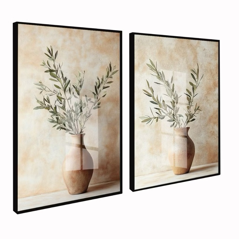 Duo Quadros Decorativos com Moldura e Vidro Vaso de Flores Folhas Neutro Quarto Sala