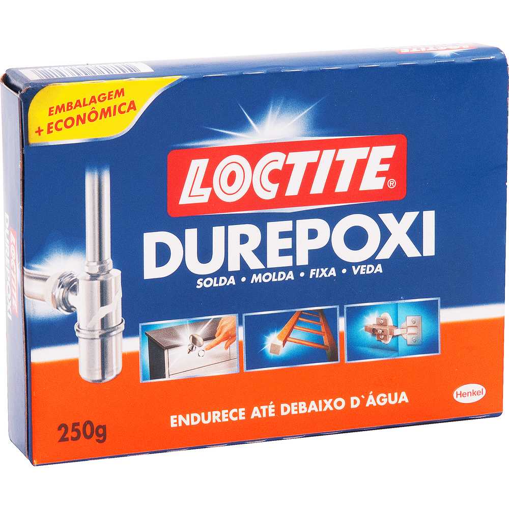 Massa Adesiva Epóxi Durepoxi - 250g Descrição: - O Adesivo Durepoxi da Loctite e altamente recomendado para Metais, vidros, madeiras, cerâmicas, cimentos, mármore e plásticos; - Perfeito para quem deseja restaurar superfícies danificadas ou preencher espaços; - Para dar um resultado perfeito ao seu trabalho, o Durepoxi da Loctite aceita acabamentos finais com tinta ou verniz, serras ou lixas. Informações Gerais: - Extra forte e resistente; - Endurece ate debaixo d'agua; - Cola quase todos os materiais. Aplicações Sugeridas: - Metal; - Vidro; - Madeira; - Cerâmica; - Cimento; - Mármore; - Plástico. Especificações Técnicas: - Temperatura de trabalho: -50oC a 150oC; - Estado físico: Massa; - Conteúdo: 250 g. Modo de Usar: - Misture em partes iguais ate formar uma massa cinza homogênea; - Aplique em seguida; - Nivele a massa com os dedos ou ferramenta umedecidos; - Espere 12 h para dar acabamento com tinta e/ou verniz, serra ou lixa; - Lave as mãos imediatamente após o uso. Itens Inclusos: - 01 Massa Adesiva Epóxi Durepoxi 250g Loctite.