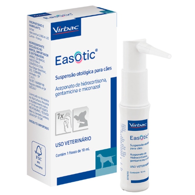 A MANADA ANIMAL é um marketplace de produtos veterinários. É a escolha certa para tutores que prezam pela qualidade dos produtos que seu animal necessita. Tudo com o suporte de uma equipe de veterinários e gestores com mais de 10 anos de experiência no mercado. Fique tranquilo, todos os nossos produtos são originais, adquiridos através de distribuidores credenciados! Ah, e todas as vendas acompanham nota fiscal! MANADA ANIMAL, Tranquilidade pra você, cuidado para ele!___________________________________________________________________________________________________ Solução Easotic De Tratamento Otológico de Cães 10ml Oferta - Aproveite as últimas unidades com preço promocional! Diga adeus à otite externa do seu cãozinho! O EasOtic é um remédio produzido pela Virbac para combater otite externa bacteriana ou fúngica em cães. A sua fórmula é ideal para eliminar fungos, bactérias ou parasitas alojados no ouvido do seu cachorro. Um antibiótico composto por 1.505UI de gentamicina, 15,1 mg de miconazol e 1,11 mg de hidrocortisona aceponato por ml. Sendo ideal para manter o ouvido do seu animal de estimação sempre saudável. ESPECIFICAÇÕES: - Indicado para cães - Indicado para tratamento de otites externas - Frasco de 10 ml BENEFÍCIOS: - Tratamento eficaz em apenas 5 dias. - Sistema de aplicação que confere uma dosagem adequada à diferentes raças e porte. - Cânula atraumática flexível que permite uma redução do potencial de dor durante a administração e aplicação adequada do produto independentemente da posição do cão. MODO DE USAR: - Lavar bem as mãos - Agitar bem antes de usar. -Utilizar somente a via tópica. - Caso necessário, antes do tratamento, limpar o conduto auditivo do animal. - Introduzir a cânula atraumática no conduto auditivo afetado do cão. Aplicar 1 mL de Easotic® pressionando o bico aplicador uma única vez, independentemente do tamanho do animal. - Após a aplicação, massagear suavemente a base da orelha do animal com as mãos. FÓRMULA: – Cada 100 ml contém: - Hidrocortisona aceponato 111mg - Gentamicina sulfato 150.500UI - Miconazol nitrato 1510mg - Veículo....q.s.p 100,0ml POSOLOGIA: - Administrar 1 ml do produto (que corresponde à dose de 1,11mg de hidrocortisona aceponato, 1.505UI de gentamicina e 15,1mg de miconazol) por orelha por dia, durante no mínimo 5 dias consecutivos. - Reavaliações periódicas pelo Médico Veterinário são recomendadas para o estabelecimento da correta duração do tratamento, de acordo com a gravidade do caso. CONTRAINDICAÇÕES: - Não administrar o produto em animais que apresentem hipersensibilidade a qualquer dos componentes da formulação. Não administrar em cães com perfuração da membrana timpânica. ITENS INCLUSOS: - 1 Frasco de Easotic Solução Otológica Para Cães DÚVIDAS FREQUENTES: - O envio é imediato? R:Sim, como temos o produto em estoque, embalamos e enviamos logo que recebemos o pedido. - O produto é original? R:Sim, todos nossos produtos são originais e adquiridos com nota fiscal de compra, afinal nosso objetivo é garantir a satisfação dos nossos clientes e o bem estar de seus animais. - Emite nota fiscal? R: Sim, emitimos notas fiscais para todas nossas vendas