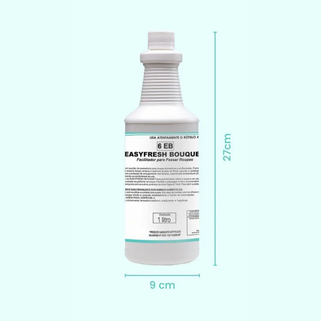 • Características do Produto: - Auxiliar de passadoria para roupas. Formulado com matérias-primas de última geração, possui em sua composição a emulsão de silicone polidimetilsiloxano, facilitando a operação de passadoria, ao mesmo tempo que amacia e perfuma tecidos de fibras naturais e sintéticas, eliminando a aspereza das roupas e dificultando o enrugamento. Suporta alta temperatura (200°C), otimizando o efeito passa fácil, reduzindo a eletricidade estática dos tecidos, garantindo a sensação de bem-estar ao usuário. Indicado para hotéis, motéis, pousadas, clínicas médicas, hospitais, indústrias, lavanderias profissionais que lavam roupas domésticas, etc. • Especificações Técnicas: - Aparência: Líquido turvo; - Cor: Levemente amarelado a branco; - Odor: Bouquet; - pH: 4,0 - 6,0; - Composição: Água, agente formador de filme, conservante, tensoativo catiônico, coadjuvante e fragrância. • Modo de Uso: - Utilizar com auxílio de frasco pulverizador; - Pulverizar sobre o tecido limpo e iniciar a passagem com ferro ou calandra; - Para melhor efeito anti-rugas e gomagem, recomendamos o uso puro.
