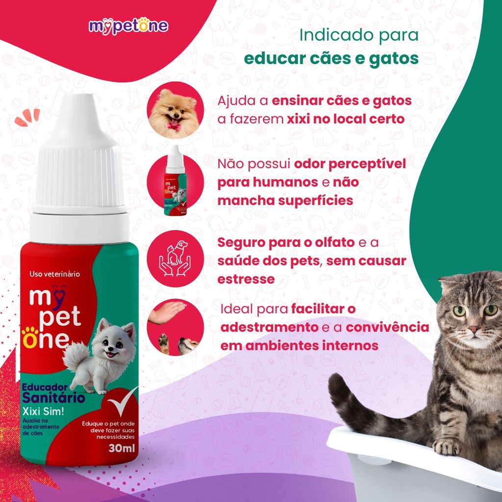 Educador Sanitário Xixi Sim Mypetone - 30mL - Facilidade e comodidade na convivência com o seu melhor amigo; - Não mancha os objetos que o liquido entra em contato; - Auxilia o pet a realizar o xixi no local que você desejar; - Não prejudica olfato ou a saúde do seu pet; - Ajuda a educar o pet sem estresse; - Não tem odor para os humanos. Detalhes O Educador Sanitário Xixi Sim Mypetone, é um produto indicado para auxiliar no adestramento sanitário para cães e gatos. Impedindo que seu pet, faça xixi em locais indesejáveis para você. Dicas Especiais Pingue 05 gotas do Educador Sanitário Xixi Sim diariamente em uma folha de jornal, em um tapete higiênico ou num pano com o qual tenha a urinar o animalzinho e coloque em um lugar de sua preferência. após alimentar o animalzinho, leve-o para o local desejado, deixando que o cheire. sendo necessário, insista por algumas vezes, pois logo o animalzinho aprenderá o ensinamento e passará a fazer ali suas necessidades. quando se acostumar com o local escolhido, passe a pingar o produto uma vez por semana de forma contínua e ininterrupta. a interrupção da aplicação do produto acarretará a desobediência do animalzinho. Indicação: Cachorros, Gatos Porte/Raça: Raças Pequenas, Raças Médias, Raças Grandes Idade: Filhotes, Adultos, Idosos Composição: Uréia, Carbonato de Amônio. Apresentação: 30mL