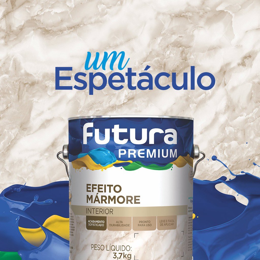 Efeito Mármore Futura – Galão 3,7 kg O Efeito Mármore Futura é uma textura decorativa que proporciona acabamento sofisticado, simulando o aspecto natural do mármore. Ideal para ambientes internos, o produto oferece excelente cobertura, alta resistência e acabamento diferenciado, sendo indicado para superfícies previamente preparadas com fundo apropriado. Características: Tipo: Textura decorativa especial Efeito: Mármore polido Base: Água Uso: Interno Aplicação: Desempenadeira de aço inox e espátula Rendimento: Aproximadamente 6 a 8 m² por embalagem (varia conforme a técnica) Demãos: 2 a 3 Secagem: Ao toque: 1 hora Final: 24 horas Cura total para limpeza com pano úmido: 7 dias Diluição: Pronto para uso (se necessário, pode-se adicionar pequena quantidade de água para facilitar a aplicação)