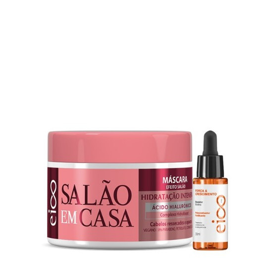Contém: 01 Eico Máscara Salão Em Casa Hidratação Intensiva 270g 01 Eico Booster de Tratamento 30ml (DE SUA ESCOLHA) SALÃO EM CASA TRATAMENTO ( Ácido Hialurônico & Complexo Hidraboost ) HIDRATAÇÃO INTENSIVA | NOVA FÓRMULA VEGANO Cabelos ressecados e opacos; ÁCIDO HIALURÔNICO Sua ação umectante e preenchedora trata os fios da raiz às pontas para recuperar os cabelos mais ressecados. Também é responsável por formar uma pelíucula protetora, que ajuda a reter a umidade essencial à saúde dos cabelos e a reduzir o frizz. COMPLEXO HIDRABOOST Tecnologia exclusiva enriquecida com blend de ativos com alto poder hidratante, composto por Aloe Vera, Biotina, Ômegas 3 e 6, Vitaminas E, B5 e A. Sua ação restauradora repõe os nutrientes essenciais à saúde dos fios para devolver maleabilidade, maciez e brilho. BOOSTER TRATAMENTO EICO PRO Nossos Boosters foram desenvolvidos para atender todas as necessidade do cabelo e potencializar seu tratamento PRO desde a higienização até a finalização em todas as linhas. Deslize para o lado, descubra seus benefícios e entenda porque você precisa de cada um deles >>> Não sabe como usar? Você pode escolher qualquer Booster para nossas recomendações: Shampoo e Leave in - meia a uma pipeta; Máscara e Condicionador - uma a três pipetas. Pronta para ativar seu Modo PRO? *BOOSTER TRATAMENTO OBRIGATÓRIO Eico Professional Tratamento Obrigatório é ideal para cabelos denificados e porosos. Foi desenvolvido para ajudar a manter seus fios tratados por mais tempo e para prevenir os danos causados por processos químicos e mecânicos. PRÓ -VITAMINA B5 Ativo altamente hidratante, composto por Ácido Pantotênico, trata até as partes mais ressecadas para disciplinar os fios. RESULTADOS COMPROVADOS EM LABORATÓRIO Característica/Ação Indicação Cabelos danificados e porosos. Ativos Enriquecido com caviar verde e ácido hialurônico *BOOSTER FORÇA E CRESCIMENTO A linha Eico Professional Força & Crescimento. Foi desenvolvido com uma fórmula que promove força e crescimento capilar com muito mais saúde. Booster Biotina Eico Professional Força & Crescimento 30ml. É um tratamento condicionante de alta potência que potencializa, Fortifica, restaura a estrutura dos fios. Característica/Ação - Potencializador; - Fortificante; - Condicionante. Indicação Para crescimento capilar e fortalecer os cabelos compridos. Ativos Enriquecido com extrato Ginseng+Biotina+Pantenol *BOOSTER CACHOS MÁGICOS Eico Professional une tecnologia e excelência em fórmulas de alto desempenho para um cuidado capilar avançado. O Booster é uma infusão concentrada de Bio-Ceramidas ideal para potencializar as etapas desejadas da sua rotina de tratamento capilar. BIO-CERAMIDAS Ativo de alta afinidade com a fibra capilar, potencializa a hidratação e o fortalecimento do fio. Age intensamente nas áreas mais frágeis, fecha as cutículas e realça o brilho. RESULTADOS COMPROVADOS EM LABORATÓRIO Característica/Ação: Para cabelos cacheados, ondulados, crespos, volumosos ou em transição. Ativos Enriquecido com Bio-ceramidas * BOOSTER LISO MÁGICO A Linha Eico Life Liso Mágico é uma linha multifuncional que poderá ser usada antes, durante ou após qualquer procedimento de alisamento ou escova. Ela irá reduzir gradativamente o volume e frizz dos cabelos alisados ou lisos. Com a Linha Eico Life Liso Mágico, seus fios se manterão disciplinados, com brilho e com efeito liso duradouro. Booster Eico Professional Pró-Vitamina B5 Liso Mágico é potencializador hidratante cabelos lisos, alisados e com frizz . Ela prolonga o efeito liso dos fios. Pode ser usada tanto antes quanto durante ou depois de fazer progressiva ou escova com o secador. Possui fórmula especial que diminui o volume e o frizz. Proporciona uma bomba de disciplina para seus fios que ficam completamente alinhados e com muito brilho. Característica/Ação Indicação Para cabelos lisos, alisados e com frizz. Ativos Enriquecido com Vinagre de Maçã e Phyto Keratin