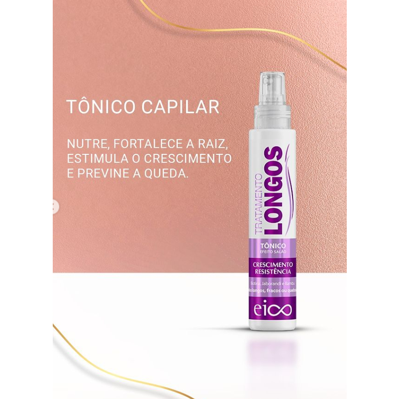 TÔNICO TRATAMENTO LONGOS EFEITO SALÃO A linha Eico Tratamento Longos foi desenvolvida para cuidar dos cabelos longos, fracos e quebradiços. O segredo do Efeito Salão vem de sua formula enriquecida com Biotina, Extratos de Jaborandi e Bambu. O Tônico fortifica e estimula o bulbo capilar para prevenir a queda prematura dos fios e ajudar no crescimento saudável. Efeito Salão Biotina: Fortalece a fibra capilar, previne contra a quebra, além de hidratar e devolver massa aos fios. Os cabelos crescem mais saudáveis e resistentes. Extrato de Jaborandi: Rico em nutrientes que revitalizam da raiz s pontas, recupera à saude e ajuda a preservar o comprimento dos fios. Extrato de Bambu: Sua Alta concentração de aminoacidos recupera a fibra capilar para fortalecer os fios danificados e sem vida. VEGANO | 0% PARABENO, PRETOLATO, CORANTE E SAL.