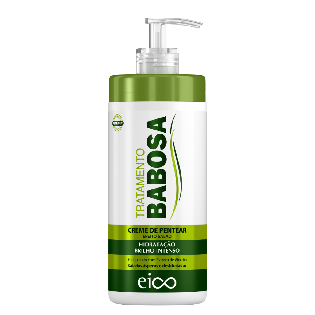 EICO BABOSA ALOE VERA NOVA FORMULA EICO LINHA VEGANA Piscou, hidratou! Maciez instantânea para os meus fios. A Linha Eico Babosa Aloe Vera foi desenvolvida com o poderoso extrato da babosa, uma planta que contém 12 vitaminas, 15 enzimas, 18 aminoácidos, 20 minerais, 75 nutrientes e mais de 150 princípios ativos, óleo de rícino e biotina, que promove ação antioxidante, hidratação profunda, crescimento saudável e fortalecimento dos fios, evitando a quebra. Indicação: Para cabelos que precisam de hidratação imediata. Ativos: Enriquecidos com 12 vitaminas, 15 enzimas, 18 aminoácidos, 20 minerais, 75 nutrientes e mais de 150 princípios ativos, entre eles o óleo de rícino e a biotina. Aplicação: Shampoo Aplique o produto sobre o cabelo úmido e massageie suavemente. Enxágue em abundância e repita a operação. Para um melhor resultado, utilize a linha completa Eico Babosa Aloe Vera. Condicionador Após lavar e enxaguar o cabelo, aplique uma pequena quantidade do produto sobre a palma das mão, massageando. Em seguida, aplique do comprimento às pontas dos fios evitando a raiz e deixe agir de 1 a 2 minutos e enxágue em abundância. Para um melhor resultado, utilize a linha completa Eico Babosa Aloe Vera. Máscara Aplique a máscara sobre os cabelos limpos e úmidos, enluve do comprimento às pontas, evitando a raiz. Use os dedos ou um pente para desembaraçar os fios delicadamente. Deixe agir de 5 a 10 minutos e enxágue. Contém: 01 Eico Babosa Aloe Vera Shampoo 450ml 01 Eico Babosa Aloe Vera Condicionador 400ml 01 Eico Babosa Aloe Vera Máscara 270g 01 Eico Finalizador Creme de Pentear 600ml