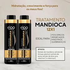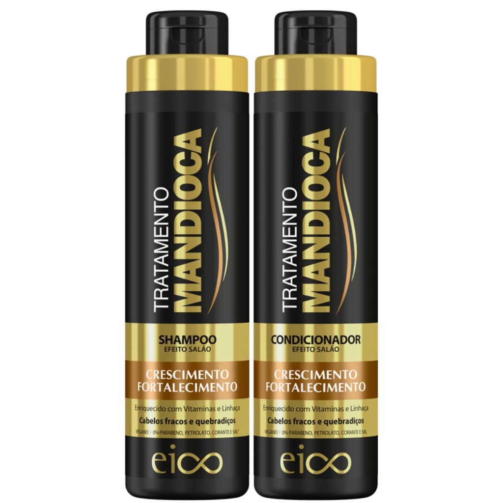 TRATAMENTO MANDIOCA CABELOS FORTES E HIDRATADOS A linha EICO Tratamento Mandioca + Vitaminas 12×1, foi desenvolvida para cabelos que necessitam de fortalecimento, nutrição, reposição de vitaminas e proteção. Rico em ativos como o Extrato de Mandioca, Extrato de Linhaça, Plantcol, Extrato de Aveia, Extrato de Aloe Vera, Vitamina C e Vitamina E. Seus fios crescerão saudáveis, fortes, brilhantes, protegidos e disciplinados. A linha é composta pelo Shampoo Tratamento Mandioca, Máscara Tratamento Mandioca, Condicionador Tratamento Mandioca e Leave-in Tratamento Mandioca em tamanho família ou individual. SHAMPOO TRATAMENTO MANDIOCA Aplique o produto sobre o cabelo úmido e massageie suavemente. Enxágue em abundância e repita a operação. Para um melhor resultado, utilize a linha completa EICO Tratamento Mandioca + Vitaminas. CONDICIONADOR TRATAMENTO MANDIOCA Após lavar e enxaguar o cabelo, aplique uma pequena quantidade do produto sobre a palma das mãos massageando. Em seguida, aplique do comprimento as pontas dos fios evitando a raiz e deixe agir de 1 a 2 minutos e enxágue em abundância. Para um melhor resultado, utilize a linha completa EICO Tratamento Mandioca + Vitaminas. Contém: 01 EICO Mandioca Shampoo 800ml 01 EICO Mandioca Condicionador 750ml