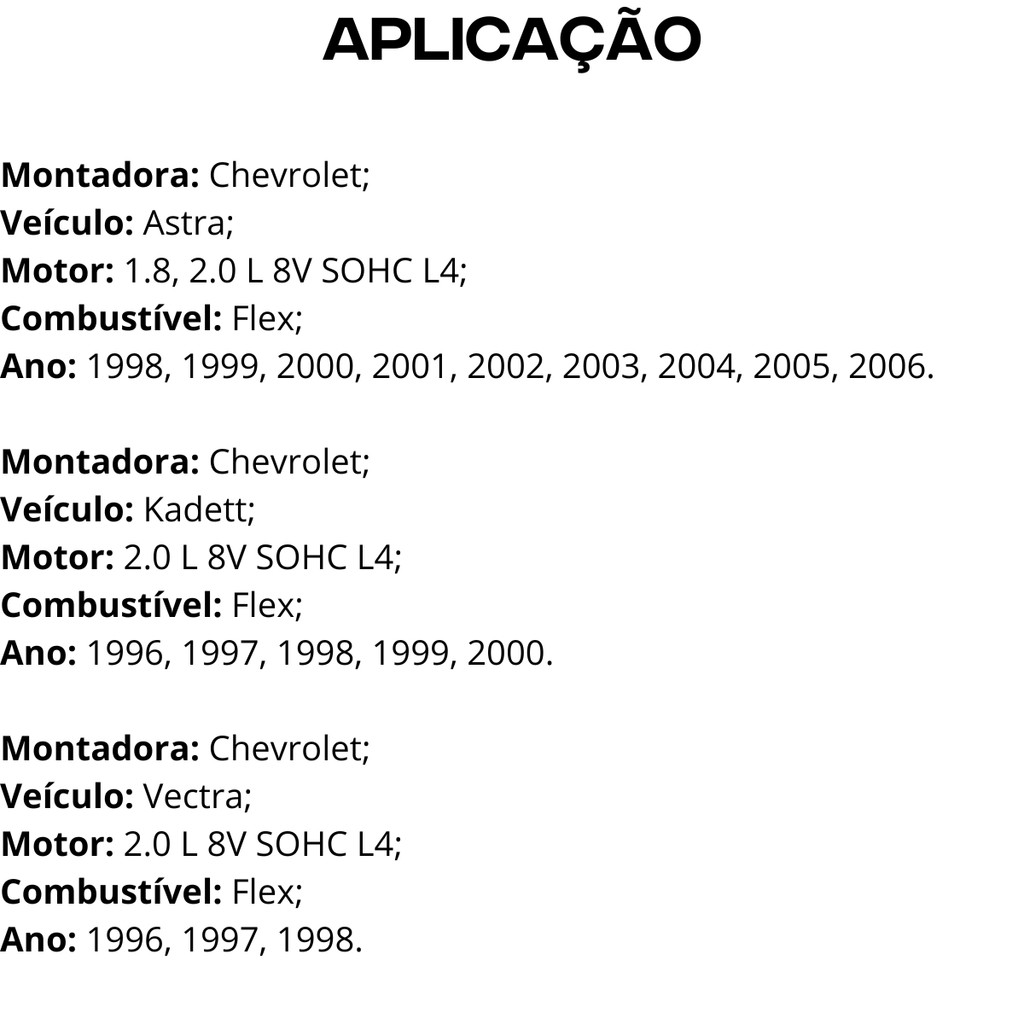 Este anúncio contém: 01 (Um) Eixo de Comando; Marca: Mahle; Código: EV0140047. Acompanha Certificado de garantia e nota fiscal. Montadora: Chevrolet; Veículo: Astra; Motor: 1.8, 2.0 L 8V SOHC L4; Combustível: Flex; Ano: 1998, 1999, 2000, 2001, 2002, 2003, 2004, 2005, 2006. Montadora: Chevrolet; Veículo: Kadett; Motor: 2.0 L 8V SOHC L4; Combustível: Flex; Ano: 1996, 1997, 1998, 1999, 2000. Montadora: Chevrolet; Veículo: Vectra; Motor: 2.0 L 8V SOHC L4; Combustível: Flex; Ano: 1996, 1997, 1998. N° Conversão: 221; 93.247.257 H; EC257257; 520120401; SB257; AL241400.