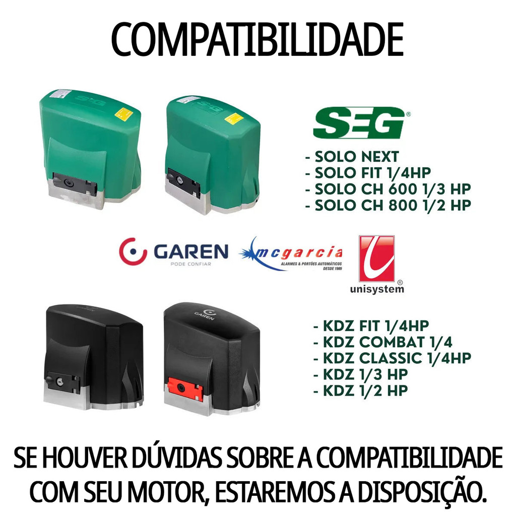O conjunto Eixo Completo de Tração KDZ S00878 da Garen é uma peça original de fábrica, projetada para motores da linha KDZ utilizados em automatizadores de portões deslizantes. O conjunto vem completo e pré-montado, facilitando a substituição do sistema de tração com encaixe perfeito e desempenho garantido. Características gerais - Código: S00878 - Marca: Garen (peça original) - Aplicação: motores da linha KDZ (automatizadores de portão deslizante) - Indicação de uso: substituição em casos de desgaste, folga ou perda de desempenho Especificações técnicas - Eixo principal: diâmetro de 17 mm - Coroa interna: 23 dentes (Z23) - Engrenagem de saída: 18 dentes (Z18) - Relação de redução: 1:23 - Material: aço e componentes metálicos de alta resistência - Montagem: conjunto completo e pronto para instalação Compatibilidade e aplicação Compatível exclusivamente com os motores Garen da linha KDZ. Ideal para manutenção corretiva e preventiva, garantindo a tração adequada e a força necessária para o deslizamento suave do portão. A instalação deve ser feita por técnico qualificado, assegurando o alinhamento e a lubrificação corretos. Componentes principais - Eixo de tração central - Engrenagem Z18 (saída) - Coroa Z23 (redução) - Suportes, buchas e rolamentos internos - Sistema de fixação compatível com a carcaça original KDZ Benefícios - Peça original Garen, com qualidade e durabilidade superiores - Substituição rápida e simples (instalação tipo plug-and-play) - Recupera o desempenho, eliminando ruídos e folgas - Alta durabilidade devido aos materiais resistentes - Encaixe perfeito para os motores KDZ Recomendações de instalação - Verificar compatibilidade do motor antes da instalação - Garantir o alinhamento correto da cremalheira - Aplicar lubrificação conforme especificação do fabricante - Verificar e apertar os parafusos de fixação adequadamente - Fazer inspeções periódicas para detectar desgastes Quando substituir A troca é recomendada quando houver ruídos metálicos, folgas no motor, perda de força, desgaste visível das engrenagens ou após longos períodos de uso intenso. A substituição do eixo completo restaura o desempenho e prolonga a vida útil do automatizador. O Eixo Completo de Tração KDZ S00878 é a solução ideal para garantir força, estabilidade e suavidade no funcionamento dos automatizadores Garen da linha KDZ. Itens Inclusos: 01 Conjunto Completo Eixo Tração KDZ