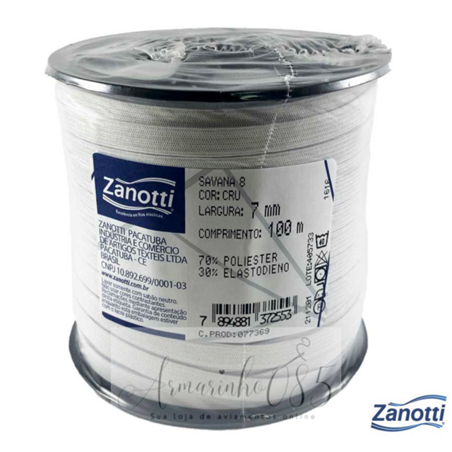 Elástico de Embutir Savana - Zanotti Características do produto: Marca: Zanotti. Comprimento: 100 metros Composição: Poliéster / Elastodieno. Larguras: 05mm, 07mm, 09mm, 11mm, 14mm. (Verifique disponibilidade) Elástico tradicional com ótima resistência e qualidade de produtos Zanotti. Utilizado para confecções e artesanato. Podem ser aplicados em bermudas, camisetas, pijamas, tecidos e outros. -PRODUTO ORIGINAL E LACRADO, DIRETO DA FABRICA DA ZANOTTI! A Zanotti é referência no segmento de fitas elásticas em toda a América e uma das maiores do mundo!