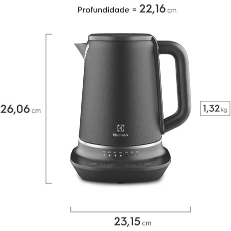 Controle a temperatura da água para atingir a perfeição em qualquer receita com a Chaleira Elétrica Electrolux Expert EKP70. O produto oferece a versatilidade que você precisa para ampliar sua experiência de sabores. A chaleira conta com a Tecnologia PerfectSense, que aquece a temperatura da água com maior precisão para atender às necessidades de diversos preparos. Com variação entre 40°C e 100°C, prepare mamadeiras a 40°C, chimarrão a 80°C e até café a 95°C. Ative a Função Manter Aquecido e conserve a água quente, na temperatura ideal, por até 40 minutos. A chaleira oferece uma ótima capacidade de 1,7L e conta com o indicador transparente do nível de água para facilitar a visualização da quantia colocada para preparo. A base de aquecimento 360° é prática para o dia a dia, já que permite encaixar o corpo do produto em qualquer ângulo. Para tornar sua abertura mais segura e fácil, a chaleira conta com a Tampa Pop-Up, por isso ela só abre quando este sistema é acionado, evitando riscos de derramamento da água no momento de servir. Além disso, oferece maior segurança ao desligar automaticamente quando não há líquido suficiente dentro do reservatório. Ao finalizar o aquecimento, a chaleira emite um aviso sonoro e desliga imediatamente. O design do produto é projetado em aço inox com acabamento premium texturizado, mesclando elegância e durabilidade para sua cozinha. Combine a sofisticação do produto a outros itens eletroportáteis da Linha Electrolux Expert e vivencie o design que te inspira. Kettle_EKP70_FrontView_Electrolux_1000x1000-principal Tecnologia PerfectSense: ideal para atingir a temperatura exata dos mais diversos preparos. Varia o controle de temperatura entre 40°C até 100°C. Função Manter Aquecido: conserva a temperatura por até 40 minutos. Ótima capacidade: 1,7L para você aquecer a quantidade ideal de água para diversas receitas. Design Premium: Projetada em aço inox, o acabamento é texturizado e oferece alto padrão de elegância. Indicador Transparente do Nível da Água: Visualize facilmente a quantia colocada para preparo. Tampa Pop-Up: Segura para o dia a dia, a chaleira só abre caso este sistema seja acionado. Base 360°: Posicione a jarra na base de aquecimento em qualquer ângulo, com facilidade. Sistemas de Segurança Integrados: A chaleira desliga automaticamente caso não haja água suficiente no reservatório. Desligamento automático: o produto emite aviso sonoro e desliga automaticamente ao atingir a temperatura de aquecimento desejada. Facilidade de Transporte: Corpo da chaleira livre de fios. Alça Ergonômica: Oferece máximo conforto no manuseio. Enrolador de Cabo: A base de aquecimento possui enrolador de fios para manter sua cozinha organizada quando o produto não está em uso. Desligamento automático Sim Capacidade da jarra 1,7L Tensão elétrica (V) 127V ou 220V Potência 1250W Indicador de nível de água Sim Luz indicadora de funcionamento Sim Material Aço Inoxidável Consumo de energia 1,25kW/h Base 360° Sim Função manter aquecido Sim Cor predominante Black Pearl Tampa pop up Sim Tecnologia PerfectSense Sim Temperaturas pré definidas Sim