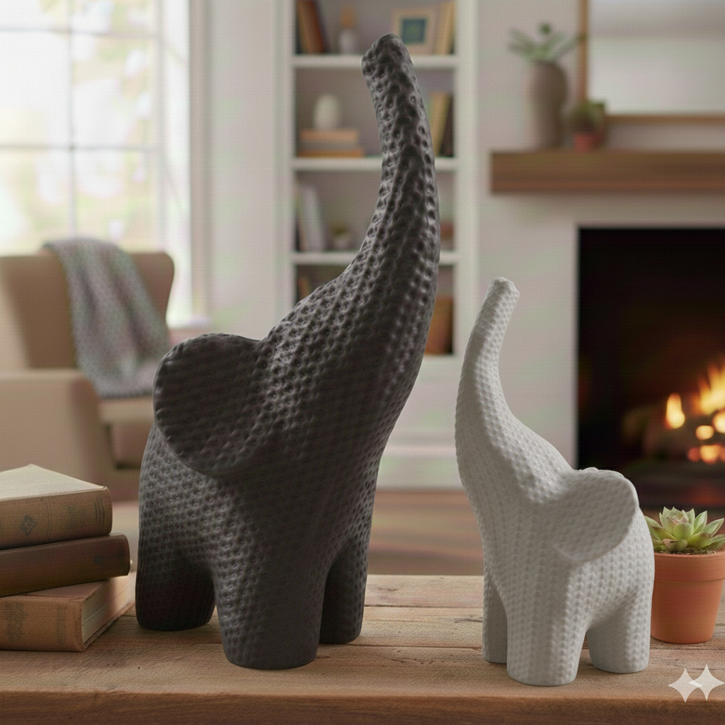 Elefantes Decorativos Estilo Crochê – Artesanal, Moderno e Elegante Transforme sua decoração com estes elefantes decorativos exclusivos, criados com textura que imita crochê e acabamento moderno. Além de trazer sofisticação, os elefantes simbolizam prosperidade, sorte e proteção, sendo perfeitos para sala, quarto, escritório ou como presente especial. ✨ Destaques do Produto ✔️ Design moderno com efeito artesanal de crochê ✔️ Símbolo de boa sorte e prosperidade no lar ✔️ Combina com diversos estilos de decoração (moderno, rústico, minimalista, boho) ✔️ Ideal para presentear em aniversários, casamentos, inaugurações e datas especiais ✔️ Produzido em material de alta qualidade e durabilidade 📐 Medidas Aproximadas Elefante Grande: 15 cm Elefante Pequeno: 10 cm 🎁 Perfeito para decorar e encantar Seja para dar mais charme à sua casa ou para presentear alguém querido, este conjunto de elefantes é a escolha certa!