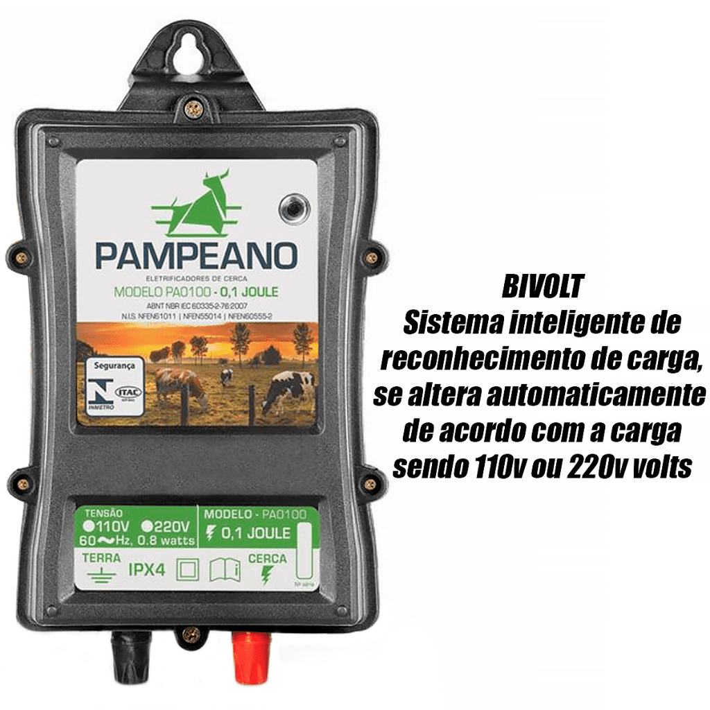 ENVIAMOS NO MESMO DIA EM COMPRAS ATÉ AS 11 HORAS EM DIAS ÚTEIS Utilização Esse kit é destinado à criação de cercas para pequenos animais, como cachorro, gato, galinha, coelho entre outros. Será necessário aterramento e fio eletroplástico com os devidos isoladores para a cerca funcionar corretamente. Veja em nossa loja todos os produtos. Características ELETRIFICADOR PET0100 BIVOLT PAMPEANO - Voltagem do choque: 9000 V - Energia de saída: 0,1 J - Energia acumulada: 0,3 J - Potência: 0,8 W - Alcance: 20 km - Raio de alcance - 500 metros - Bivolt: 127V - 220V - Dimensões: 22,5cm x 18cm x 9cm (A x L x P) - Marca: Pampeano - Modelo: PET0100 IMAGENS MERAMENTE ILUSTRATIVAS OBSERVAÇÕES Não machuca o animal, apenas irá repelir, com a utilização o animal não vai mais encostar e ficar tomando um choque sempre. Não recomendado para animais com menos de 1 Kg e menos de 6 meses de vida. As vantagens de se ter uma cerca elétrica residencial, industrial ou rural incluem: Segurança efetiva com a dissuasão de intrusos, proteção de propriedade e pessoas, detecção de tentativas de invasão, facilidade de instalação, BAIXO CUSTO E MANUTENÇÃO, operação 24 horas por dia, resistência a condições climáticas adversas, flexibilidade de configuração, compatibilidade com sistemas de segurança adicionais e controle de acesso. Além destes, a cerca elétrica além de prevenção contra animais invasores que podem tentar adentrar sua residência, estabelecimento comercial ou sua propriedade rural, podendo causar prejuízos de variados tipos, ela também educa o seu próprio animal, sendo ele um pet de pequeno porte, ou até mesmo animais de fazendas de médio e grande porte, como ovinos e gado nelore, entre outros. A cerca terá a função de educar este animal, a não tentar mais ultrapassar o limite imposto pela cerca, pois após várias tentativas de ultrapassagem o animal for repelido, ele vai entender que ali é o seu limite, e que há algo ali que o repele e assim com o tempo, somente de visualizar a cerca não encoste mais caso chegue muito próximo, já sabendo que será repelido. Não há efeitos colaterais no animal de grande ou pequeno porte (excluindo os que apresentam idade avançada ou recém nascidos, e ou algum problema cardíaco), o choque como dito gera uma barreira psicológica no animal. Recomendações de Uso e Instalação * Ao realizar a escolha do eletrificador é fundamental considerar uma margem de reserva de energia para ter a máxima segurança na sua instalação e funcionamento, assim como facilitar a possibilidade de futura ampliação da área A capacidade do energizador deve superar amplamente o comprimento (Metros Lineares) da cerca elétrica a construir. * O alcance dos eletrificadores estimado em Km vária com a umidade do solo, crescimento da vegetação e contato com o arame, construção da cerca, diâmetro dos arames, aterramento, etc. * As cercas elétricas comparadas às convencionais exigem mão-de-obra qualificada para a construção, execução de reparos e manejo, e vistorias mais frequentes para detecção de possíveis falhas no sistema e controle do crescimento da vegetação sob a cerca. * Assegure ? se sempre de que está seguindo todas as regras e padrões de segurança para cercas elétricas. Em caso de dúvida, sempre consulte um técnico especializado. Orientação de Instalação * Antes de instalar o seu aparelho, leia o manual de instruções que você terá o melhor resultado na eletrificação de sua cerca. * Procure um lugar onde o aparelho fique abrigado do sol e da chuva, se for fora do galpão é indicado construir um abrigo. * Fazer aterramento com haste de cobre ou cano galvanizado de no mínimo 2 metros para aparelhos de até 30Km, caso for maior que 30Km usar 2 a 3 hastes de 2 metros ou mais, distantes de 3 metros uma da outra, ambos têm que ser um lugar úmido, caso o lugar não possua umidade e recomendado colocar no buraco junto com a haste carvão com sal, para criar a umidade. * Conectar o terminal carga do eletrificador na cerca elétrica usando arame ou fio de cobre. * Conectar o terminal terra haste ou tubo do aterramento, usando um arame, fio de cobre. * Ligar o eletrificador na rede elétrica e está pronto para uso. Possíveis Causas de um Sistema Pouco Eficiente: * Insuficiente número de barras de aterramento * Conexões ineficientes com arames de deferentes metais * Má conexão entre as barras de aterramento * Barras de aterramento muito curtas. * Barras de aterramento muito próximas uma da outra. Isolador, Isolante, cerca, eletrica, rural, residencial, industrial, fio, eletroplastico, segurança, casa, choque, eletrificador, aparelho, de choque, muro, haste, big haste, vareta, cerca de choque, eletrificador cerca elétrica para pets, marca recomendada de eletrificador para pets, segurança cerca elétrica para animais, como instalar eletrificador para pets, eletrificador para cães/gatos, voltagem segura para eletrificador de cerca de pets, proteção para animais com cerca elétrica, onde comprar eletrificador de cerca para pets, treinam