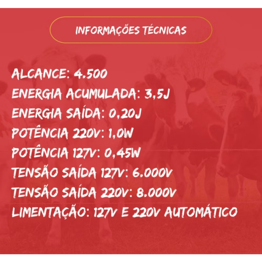 INFORMAÇÃO >> FÁCIL INSTALAÇÃO >> NÃO MACHUCA O ANIMAL >> GARANTIA DE 2 ANOS CONTRA DEFEITOS DE FABRICAÇÃO >> PARA GADO, SUÍNO EQUINOS O eletrificador é a peça mais importante do sistema de uma cerca elétrica. Sua função é transformar a energia de 12, 110 ou 220V com que é alimentado em um pulso elétrico de altíssima voltagem e curta duração, sem provocar danos físicos ao animal ou ao homem que recebe o choque. Também tem a função de garantir a isolação entre a rede elétrica (perigosa) e a cerca elétrica (segura). Informações Técnicas: Alimentação: Luz Sem regulagem Tensão: 127V-220V/60Hz (Bivolt Automático) Potência: 220V / 1,0W Potência: 127V / 0,45W Energia Acumulada: 3,5J Energia de Saída: 0,20J Alcance: 4.500 mt Conteúdo da embalagem: Manual de instruções Eletrificador 38km BVA Garantia: 2 ANOS CONTRA DEFEITOS DE FÁBRICA