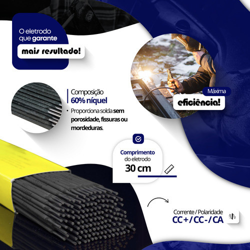 ***ATENÇÃO PARA AS QUANTIDADES DE VARETAS QUE ENVIAMOS !!! Enviamos por este anúncio: 3 varetas de eletrodos na bitola de 2,5 mm para soldagem de ferro fundido; AWS E-NiFeCI - Limável: 60% - RT 520 MPa / A 20% / D 180 HB Analise Química : C 0,82 / Si 1,6 / Mn 0,6 / Ni 60,0 Eletrodo especial com alma de níquel puro, para soldagem a frio dos vários tipos de ferro fundidos, mesmo aqueles onde condição de limpeza, não seja de todo satisfatória; Possui alto rendimento, arco elétrico suave e depositado de solda usinável, liso e isento de defeitos como trincas, poros ou mordeduras; Pode ser utilizados para soldagem entre materiais similares ou dissimilares e para enchimentos; Especial para recuperação de blocos de motores á combustão. Fotos Meramente Ilustrativas; PMJ FERROS