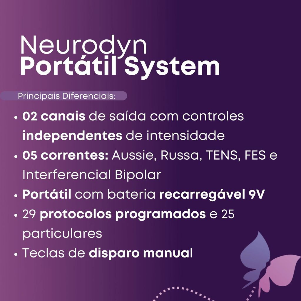 Novo Neurodyn Portátil System – Aparelho de Eletroestimulação com 05 correntes Ibramed KIT EXCLUSIVO HSMED: 08 ELETRODOS AUTOADESIVOS + 01 GEL 1KG + 02 FAIXAS ELÁSTICAS 60CM + 04 ELETRODOS 5X5CM + 01 TREINAMENTO EXCLUSIVO ONLINE!! REGISTRO ANVISA 10360319018 + 18 MESES DE GARANTIA O Novo Neurodyn Portátil System Ibramed é um aparelho indispensável para você que trabalha com tratamento de dor, fortalecimento muscular e reeducação motora. Ele é composto por 05 CORRENTES: Aussie, Russa, TENS, FES e Interferencial Bipolar. Conta ainda com 29 protocolos programados e 25 particulares, promovendo uma gama de possibilidades ao profissional em um só equipamento. O Novo Neurodyn Portátil System pode ser operado com bateria de 9V ou conectado à rede elétrica, possui 2 canais de saída com controles independentes de intensidade, teclas de disparo manual para as correntes. Associado ao seu design compacto e interface intuitiva, o Neuordyn Portátil System leva praticidade ao dia-a-dia do profissional e é ideal para atendimento HOME CARE. DIFERENCIAIS E BENEFÍCIOS NEURODYN SYSTEM - Equipamento versátil com 05 correntes e inúmeras possibilidades de uso. - 02 canais de saída com controles independentes de intensidade; - 29 protocolos programados e 25 particulares; - 05 modalidades de terapia; - Design clean e moderno; - Leve e compacto para ser transportado com facilidade; - Clip para segurança; - Teclas de disparo manual; - Bateria recarregável. INDICAÇÕES Corrente Aussie - Fortalecimento; - Hipertrofia; - Tonificação muscular; - Reeducação motora; - Aumento da drenagem linfática e vascular; - Alívio sintomático da dor aguda pós-operatória; - Aumento da circulação sanguínea local. Corrente TENS - Alívio sintomático e tratamento da dor crônica; - Aumento da circulação sanguínea local; - Alívio sintomático da dor pós-traumática aguda; - Alívio sintomático da dor pós-operatória aguda. Corrente FES e Russa - Prevenção ou tratamento de atrofia por desuso; - Aumento da circulação sanguínea local; - Reeducação muscular; - Fortalecimento muscular; - Manutenção ou aumento da amplitude de movimento; - Relaxamento de músculos espásticos. Corrente +Interferencial Bipolar - Alívio de dor aguda e crônica; - Redução de edema aguda ou crônico; - Reeducação muscular; - Relaxamento de espasmos musculares; - Melhoramento na função dos órgãos abdominais, particularmente no tratamento de incontinência; - Estimulação da circulação sanguínea local. MODOS DE USO - Seleção manual: Permite ao operador a escolha da modalidade e os ajustes de cada parâmetro. - Sugestão de uso: parâmetros prontos para execução da terapia. - Particular: permite 05 modos para cada corrente disponível no equipamento, para que o usuário programe suas terapias e salve na memória do aparelho. CORRENTES - Aussie: Corrente de Média Frequência Modulada em Burst. - Russa: Corrente de Média Frequência Modulada em Burst. - TENS: Estimulação Elétrica Transcutânea. - FES: Estimulação Elétrica Funcional. - Interferencial Bipolar: Corrente de Média Frequência Despolarizada com Modulação Senoidal. CONTRAINDICAÇÕES - Dispositivo eletrônico implantado; - Pacientes cardíacos; - Próteses metálicas; - Gravidez; - Cuidado nas aplicações em crianças, pessoas senis e epiléticos; - Pessoas com aversão ao uso de correntes elétricas. DADOS TÉCNICOS - Bivolt 127/220V | 50/60Hz; - Canais de saída: 2 canais independentes em amplitude; - Dimensões: (14 x 8 x 4) C x L x A - Peso: 0.8 kg - Registro ANVISA: 10360319018 - Tempo regulável: 01 a 60 minutos - Bateria 9V recarregável Corrente Aussie - Modo: contínuo, síncrono e recíproco; - Intensidade: 60mA; - Frequência: portadora 1 ou 4kHz, burst 1 a 120Hz; - Burst: 2 ou ms. Corrente Russa - Modo: contínuo, síncrono e recíproco; - Intensidade: 60mA; - Frequência burst: 1 a 100Hz; - Ciclo de trabalho: 10%, 20%, 30%, 40% e 50%. Corrente Interferencial Bipolar - Modo: contínuo e síncrono; - Intensidade: 60mA; - Frequência: portadora 1, 2 e 4kHz; - Frequência de batimento (AMF): 1 a 200Hz; - Frequência do Sweep: 1 a 200Hz; - Modo Sweep: off, 1/1s, 1/5/1s, 6/6s. Corrente TENS - Intensidade: 100mA; - Modo: normal, burst, convencional, acupuntura, misto, VIF e VF. Corrente FES Intensidade: 100mA; Frequência: 0,5 a 250Hz com duração de fase ajustável 50 a 500µs; Frequência VIF 10 a 100Hz com duração de fase 50 a 225µs; Modo: síncrono e recíproco. ITENS INCLUSOS - Neurodyn Portable System Ibramed - 01 Fonte de alimentação - 04 Eletrodos de borracha 5x5cm - 02 Cabos duplos branco - 03 Anéis identificador laranja - 03 Anéis identificador preto - 01 Bisnaga de gel condutor * - 01 Gel 1KG – marca enviada conforme disponibilidade de estoque - 02 Faixas Elásticas Para Fixação de Eletrodos - 60cm - 08 Eletrodos Autoadesivos 5x5cm APROVEITE! OFERTA POR TEMPO LIMITADO! DÚVIDAS? FAÇA SUA PERGUNTA ABAIXO! SERÁ UM PRAZER LHE ATENDER!