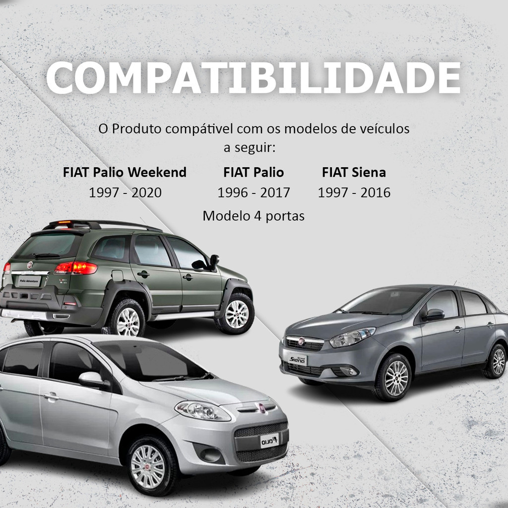 Máquina de vidro elétrica Porta Dianteira Direita ( Passageiro ) Motor Mabuchi Fiat Palio - 4 PORTAS - 1996 1997 1998 1999 2000 2001 2002 2003 2004 2005 2006 2007 2008 2009 2010 2011 2012 2013 2014 2015 2016 2017 / Palio Weekend - 1997 1998 1999 2000 2001 2002 2003 2004 2005 2006 2007 2008 2009 2010 2011 2012 2013 2014 2015 2016 2017 2018 2019 2020 / Siena - 1997 1998 1999 2000 2001 2002 2003 2004 2005 2006 2007 2008 2009 2010 2011 2012 2013 2014 2015 2016 Leia com ATENÇÃO todas as informações do anúncio e compre somente na certeza. Verifique o modelo, ano, ou qualquer dúvida nos contate no campo de perguntas antes de finalizar a compra. Produto 1ª Linha (NÃO É ORIGINAL). Caracteristicas: • Número de Portas do Veículo: 4 portas. • Acionamento Elétrico. • Encaixe do motor: MABUCHI (8 dentes). • Usa Motor de lado Invertido. • Estrutura Reforçada. • Funcionamento Suave e Silencioso. • Aplicação dianteira. • Lado Direito. • Encaixe perfeito semelhante ao da peça original. • Ideal para reposição de Peças. • Produto conforme a disponibilidade no estoque pode ser: Zinni & Guell / ASAP / GC. Ficha Técnica: • Modelo R-1436D SM. • Material Aço. Compatibilidade: • Fiat Palio 1996 - 2017 ( Modelo de 4 portas ). • Fiat Palio Weekend 1997 - 2020. • Fiat Siena 1997 - 2016. Conteúdo da embalagem: • 01 Máquina de vidro elétrica Porta Dianteira Direita ( Passageiro ). OBS: NÃO ACOMPANHA MOTOR Medidas: • Altura da embalagem: 7 cm. • Largura da embalagem: 25 cm. • Profundidade da embalagem: 53 cm. • Peso: 0,605 kg. GARANTIA: • Garantia de 3 meses após a compra. Importante: • Recomendamos que a instalação do produto seja feita por um profissional especializado e não nos responsabilizamos pelo mau uso do produto.
