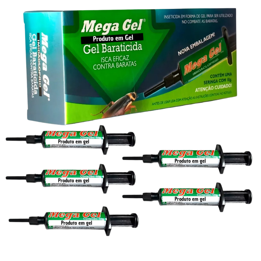 Olá, seja bem vindo Envio im ediato com Nota fiscal, produto original O Baraticida Mega Gel da Quimiagri é uma isca pronta para uso, eficaz no controle de baratas, tanto as jovens como as adultas. Ele atua como um atrativo para as baratas, que, ao ingerirem o produto, são eliminadas. A aplicação é feita em pontos estratégicos, como frestas, cantos e locais escuros onde as baratas costumam se esconder. Características e Benefícios: Eficácia: Mata baratas alemãs (Blattella germanica), Francesinha, de esgoto e americanas (Periplaneta americana), tanto jovens quanto adultas. Pronto para Uso: Basta retirar a tampa e aplicar o gel em pontos estratégicos. Segurança: Não tem cheiro, não escorre e não mancha, sendo seguro para uso em residências. Formato: Disponível em embalagens de 10g, com aplicador, para facilitar a aplicação. Local de Aplicação: Pode ser aplicado em toda a casa, em locais onde as baratas costumam se esconder ou se alimentar. Atraente: A isca atrai as baratas, que a ingerem e são eliminadas. Como Usar: Retire a tampa do bico aplicador. Pressione o êmbolo para que o gel comece a sair. Aplique pequenos filetes de 1 a 2 cm de comprimento em pontos estratégicos. A quantidade de produto a ser aplicada deve ser equivalente a 0,6g/m², ou aproximadamente 6 a 8 pontos de aplicação por m². Precauções: Mantenha o produto fora do alcance de crianças e animais domésticos. Não aplique o produto sobre alimentos, utensílios de cozinha ou perto de plantas. Evite o contato do produto com os olhos, pele e narinas de pessoas e animais. O Mega Gel da Quimiagri é uma solução prática e eficaz para controlar baratas em ambientes domésticos, com foco na segurança e praticidade de aplicação.