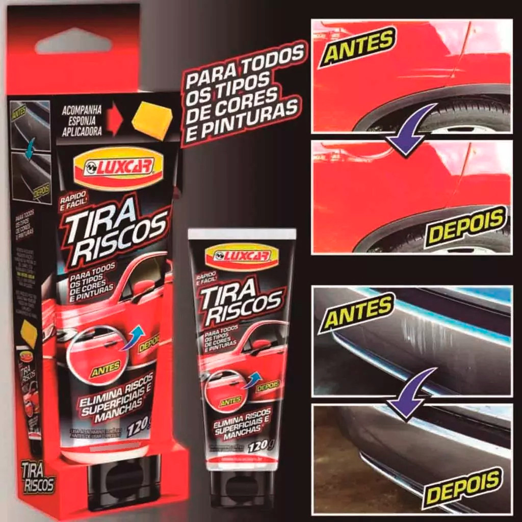 # Auto Equip # Seja bem-vindo(a)!!! --- Descrição: Tira Riscos Luxcar 120g O Tira Riscos Luxcar foi desenvolvido especialmente para remover riscos e manchas superficiais da pintura e do vidro dos automóveis. Devolve o brilho e proporciona um excelente acabamento. Ideal também para tratar pequenos danos em regiões específicas dos veículos, como: ao redor das maçanetas, fechaduras, capô, porta-malas, para-choques e retrovisores. Este produto pode ser usado em todos os tipos de cores, pinturas e acabamentos automotivos (inclusive superfícies black piano). Vantagens: - Fácil e rápido. - Para todos os tipos de cores e pinturas. - Elimina riscos superficiais e manchas. Modo de usar: Agite antes de usar. A lataria deve estar limpa, seca e fria. À sombra, aplique o produto em pequenas quantidades sobre local desejado com o auxilio de uma esponja. Espalhe bem o produto com movimentos circulares e suaves (não esfregar com força). Com auxilio de um pano de microfibra, remova o excesso do produto dando o lustro final. Para melhor proteção e brilho, utilizar em seguida a cera líquida ou em pasta superbrilho luxcar. Atenção: os resultados não são satisfatórios em riscos que já ultrapassaram a camada de verniz do seu carro. Sempre teste a compatibilidade do produto em uma área de 1 cm² não visível do veículo. Caso seja necessário, repita a aplicação. Conteúdo da Embalagem: - 01 Tira Riscos Luxcar 120g Importante - Garantia de 03 meses; - Pedidos aprovados até 12h00 de segunda a sexta será enviada no mesmo dia; - Enviamos em até 24h úteis; - Utilize o campo de "Perguntas e respostas" e esclareça suas dúvidas com nosso suporte técnico.