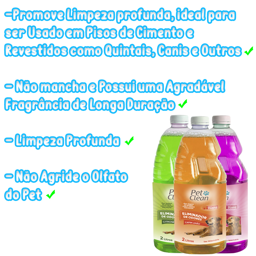 Ao conviver com pets, é normal que algumas partes da casa fiquem com cheirinhos desagradáveis. Pensando nisso, foi desenvolvido o eliminador de odores Pet Clean, que nos ajuda na missão de deixar nosso lar mais cheiroso! - Indicado para higienização de ambientes; - Produto com grande rendimento; - Desenvolvido para eliminar o mau cheiro dos ambientes destinados aos animais; - Pode ser utilizado em canis, quintais, cimentados, clínicas veterinárias, pet shops, entre outros; - Deixa um suave perfume no local Contém: 2L