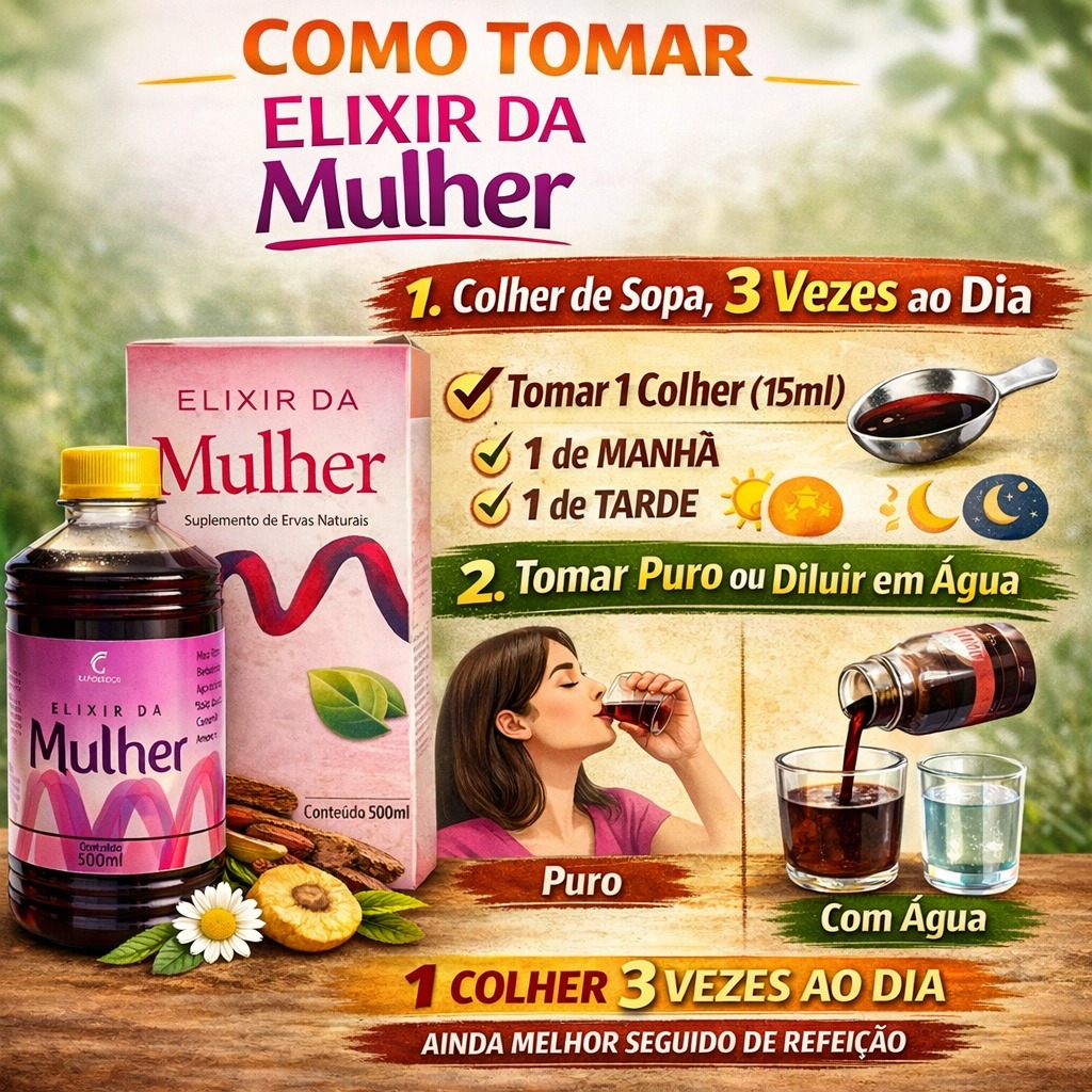 ELIXIR DA MULHER – COMPOSTO DE ERVAS NATURAIS O Elixir da Mulher é um composto líquido preparado com uma combinação de ervas tradicionalmente utilizadas em rotinas de bem-estar. Sua fórmula reúne plantas naturais selecionadas, oferecendo uma opção prática para quem prefere produtos de origem natural no dia a dia. 🌱 COMPOSIÇÃO Composto por ervas naturais como: • Barbatimão • Agoniada • João da Costa • Sangra D'água • Camomila • Uxi Amarelo • Amora 🥄 MODO DE USO Agite antes de usar. Tomar 1 colher de sopa (15 ml) 3 vezes ao dia. Pode ser consumido: ✔ puro ✔ ou diluído em água 📦 CONTEÚDO Frasco com 500ml 📌 INFORMAÇÕES IMPORTANTES • Produto natural • Armazenar em local seco e fresco • Manter fora do alcance de crianças