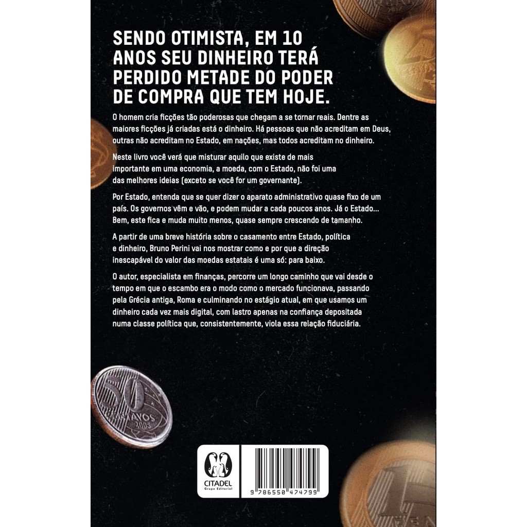 Sendo otimista, em 10 anos seu dinheiro terá perdido metade do poder de compra que tem hoje. O homem cria ficções tão poderosas que chegam a se tornar reais. Dentre as maiores ficções já criadas está o dinheiro. Há pessoas que não acreditam em Deus, outras não acreditam no Estado, em nações, mas todas acreditam no dinheiro. Neste livro você verá que misturar aquilo que existe de mais importante em uma economia – a moeda – com o Estado não foi uma das melhores ideias (exceto se você for um governante). Por Estado, entenda que se quer dizer o aparato administrativo quase fixo de um país. Os governos vêm e vão, e podem mudar a cada poucos anos. Já o Estado... Bem, este fica e muda muito menos, quase sempre crescendo de tamanho. A partir de uma breve história sobre o casamento entre Estado, política e dinheiro, Bruno Perini vai nos mostrar como e por que a direção inescapável do valor das moedas estatais é uma só: para baixo. O autor, especialista em finanças, percorre um longo caminho que vai desde o tempo em que o escambo era o modo como o mercado funcionava, passando pela Grécia antiga, Roma e culminando no estágio atual, em que usamos um dinheiro cada vez mais digital, com lastro apenas na confiança depositada numa classe política que, consistentemente, viola essa relação fiduciária.