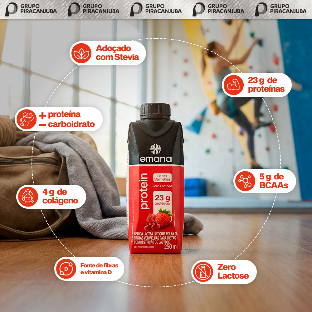 A mesma qualidade, em uma nova embalagem! Estamos atualizando nossas embalagens e, durante esse período, seu produto pode ser entregue na versão anterior. Fique tranquilo, a qualidade Emana continua a mesma em ambas as versões. A Bebida Láctea Frutas Vermelhas Emana é a combinação ideal de nutrição, sabor e praticidade para o seu dia a dia. Com 23g de proteínas por unidade, ela auxilia na recuperação muscular, na saciedade e no suporte nutricional para quem busca uma rotina mais saudável e equilibrada. Com um sabor irresistível de frutas vermelhas, feita com polpa natural e sem adição de corantes artificiais, essa bebida oferece uma experiência leve e refrescante, perfeita para qualquer momento. Além disso, sua fórmula é zero lactose, tornando-a uma excelente opção para pessoas com restrição à lactose ou que preferem uma digestão mais leve. PRINCIPAIS BENEFÍCIOS 🍓 23g de proteínas por embalagem – contribui para o ganho e manutenção da massa muscular. 🥛 Zero Lactose – ideal para quem tem intolerância ou busca mais leveza na dieta. ⚡ Praticidade – pronta para beber, ideal para consumo a qualquer hora e em qualquer lugar. 🍒 Sabor natural de frutas vermelhas – refrescante, nutritiva e deliciosa. 💪 Aliada no pré e pós-treino – auxilia na recuperação muscular e no fornecimento de energia. DIFERENCIAIS DO PRODUTO Alta concentração de proteínas (23g). Zero lactose. Elaborada com polpa de frutas vermelhas. Sem corantes artificiais, com sabor natural. Embalagem de 250ml, prática e fácil de transportar. Ideal para integrar uma alimentação equilibrada. SUGESTÃO DE CONSUMO Consumir gelada para potencializar o sabor. Perfeita como lanche proteico, opção prática de café da manhã ou como suplemento pré/pós-treino, garantindo energia e nutrição ao longo do dia. INFORMAÇÕES TECNICAS Marca: Emana Produto: Bebida Láctea Frutas Vermelhas Protein Quantidade: 12 unidades Proteínas: 23g por porção Zero Lactose Categoria: Bebida láctea proteica pronta para consumo 👉 A Bebida Láctea Frutas Vermelhas Emana 250ml é a escolha perfeita para quem busca nutrição, sabor e praticidade, unindo proteínas de alta qualidade com o frescor e o sabor irresistível das frutas vermelhas. Sobre a Emana Emana é uma marca de suplementos com foco em nutrição e bem-estar. Criada em 2021 pelo empresário e apresentador Rodrigo Hilbert, juntamente com o sócio, Eduardo Cama, a Emana tem no portfólio uma ampla linha de produtos, entre vitaminas, encapsulados, proteínas, shots funcionais e gomas. Em 2024, a marca passa a integrar o rol de negócios do Grupo Piracanjuba. O propósito da Emana é alcançar cada vez mais pessoas que buscam informação sobre saúde e acreditam na transformação de seu dia a dia a partir das boas escolhas alimentícias.