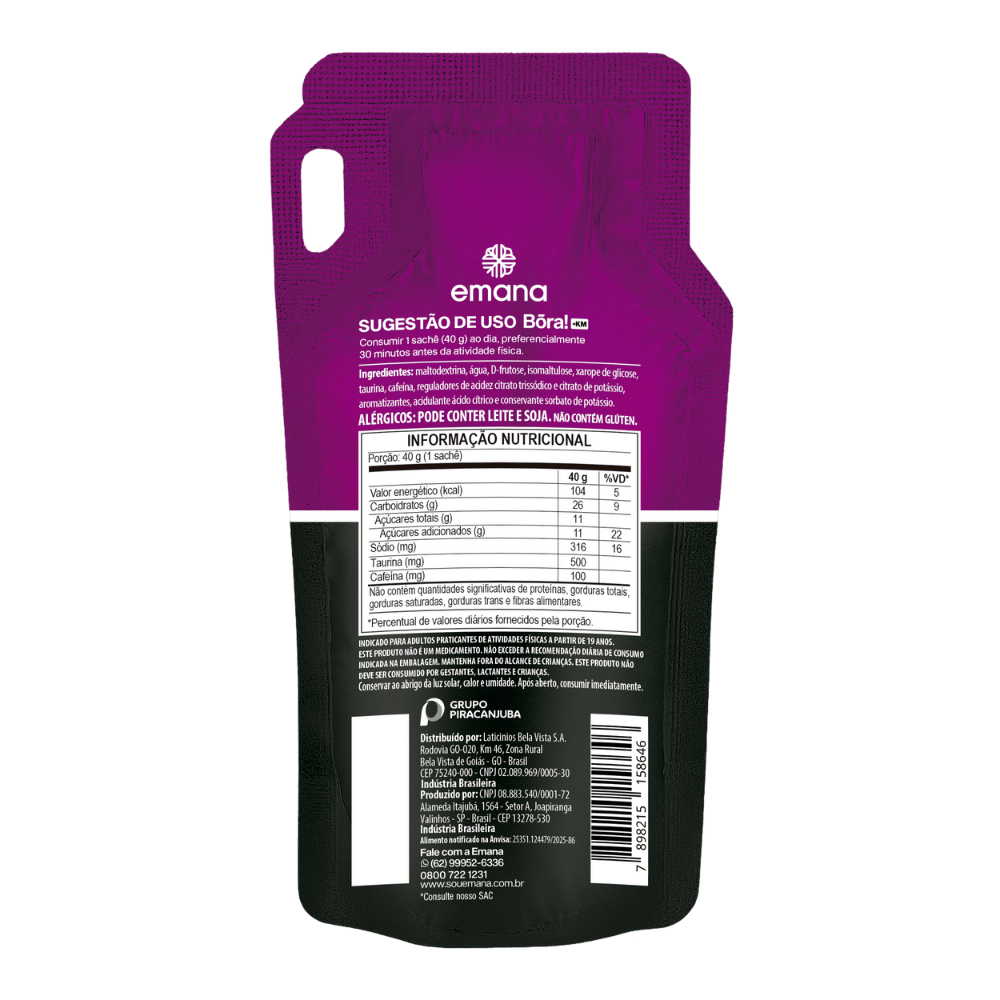 A mesma qualidade, em uma nova embalagem! Estamos atualizando nossas embalagens e, durante esse período, seu produto pode ser entregue na versão anterior. Fique tranquilo, a qualidade Emana continua a mesma em ambas as versões. GEL ENERGÉTICO +KM AÇAÍ COM GUARANÁ 40G – EMANA - Kit com 10 unidades O Gel Energético +KM Cafeína Emana é o aliado ideal para quem busca energia rápida e sustentada durante treinos e competições. Desenvolvido especialmente para atletas e praticantes de atividades físicas intensas, ele combina carboidratos de diferentes velocidades de absorção com cafeína natural e o sabor delicioso de açaí com guaraná, proporcionando mais disposição e performance. Com nova fórmula, o +KM oferece 26g de carboidratos por sachê, garantindo reposição eficiente de energia, e 75mg de cafeína, que contribui para o aumento do foco, da resistência e da concentração durante o exercício. A presença da Palatinose™ (Isomaltulose) ajuda a liberar energia de forma gradual, evitando picos de glicose e promovendo maior equilíbrio energético. Benefícios: 💪 Mais energia e resistência: combinação de carboidratos de rápida e lenta absorção. ⚡ 75mg de cafeína por sachê: mais foco e disposição para treinos intensos. 🍇 Sabor açaí com guaraná: refrescante e saboroso. 🧠 Mantém a performance mental e física por mais tempo. 🩸 Com Palatinose™: liberação gradual de energia. 🚫 Não contém glúten. Sugestão de uso: Consumir 1 sachê a cada 30 minutos de exercício intenso, conforme orientação de profissional de saúde ou nutricionista. Ingredientes: Maltodextrina, água purificada, frutose, Palatinose™ (isomaltulose), citrato de sódio, cloreto de potássio, cafeína, aroma de açaí e guaraná, acidulante ácido cítrico, conservadores sorbato de potássio e benzoato de sódio, e edulcorante glicosídeos de esteviol. Não contém glúten. Indicação: Indicado para adultos praticantes de atividade física intensa, que necessitam de energia rápida antes e durante o exercício. Ideal para provas de resistência, corridas, ciclismo, crossfit, triathlon e treinos de longa duração. Apresentação: Sachê de 40g – pronto para consumo.