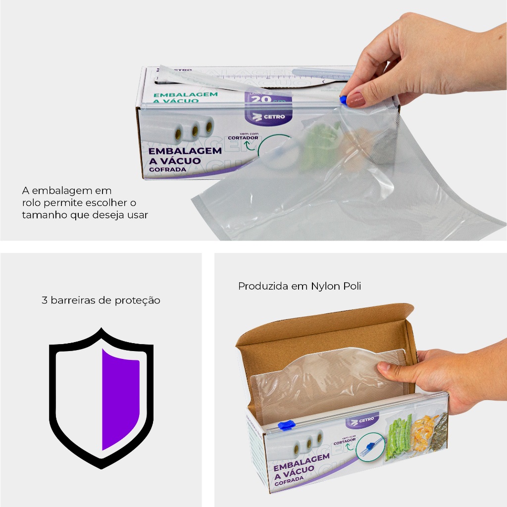 Embalagem Gofrada a Vácuo Transparente em Rolo e Caixa com Cortador - 20x500cm As embalagens gofradas em rolo transparente da Cetro são produzidas com alta tecnologia em Nylon Poli e são livres de bisfenol A, seguindo padrões de qualidade internacional. Com 27 micras e 3 barreiras de proteção, elas podem ser utilizadas em qualquer seladora a vácuo que aceite embalagens gofradas. As embalagens seladas a vácuo mantêm os alimentos protegidos por mais tempo, aumentando sua validade e mantendo todas as suas características intactas. Além disso, você pode embalar tanto alimentos crus quanto refeições prontas para serem consumidas em outro momento. ECONOMIA E SEGURANÇA! Ao utilizar as embalagens gofradas da Cetro nos processos de selagem a vácuo, você aumentará a vida útil de seus produtos e refeições, podendo ainda armazená-los em congeladores para preservar suas características naturais e seu sabor. ESPECIFICAÇÕES TÉCNICAS Cor: Transparente Forma Disponível: Em Rolo Espessura: 27 Micras Material: Nylon Poli Temperatura Máxima de Uso: 120°C Temperatura mínima de Uso: -30°C Resistência a Ácidos e Álcalis: Excelente Resistência a Óleos e Gorduras: Excelente