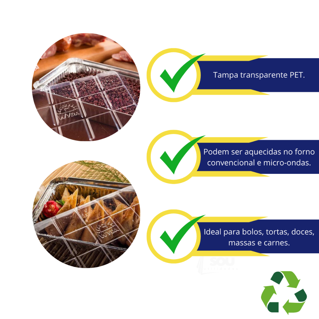 INFORMAÇÕES DO PRODUTO Bandeja de alumínio descartável em formato retangular com capacidade de 500ml. Ideais para os profissionais do varejo, as embalagens de alumínio descartáveis da linha Food Service demonstram toda a qualidade, praticidade, higiene e beleza para acomodar e servir os alimentos. MEDIDAS: 165 x 124 x 43mm Capacidade: 500 ML Produto com tampa PET, fechamento manual. CONTÉM 50 UNIDADES Podem ser aquecidas no forno convencional e micro-ondas, sigas as instruções do fabricante. ****Postagem rápida**** ****Produto em estoque**** Dúvidas? Nos envie uma mensagem que responderemos que teremos o maior prazer em respondê-lo.