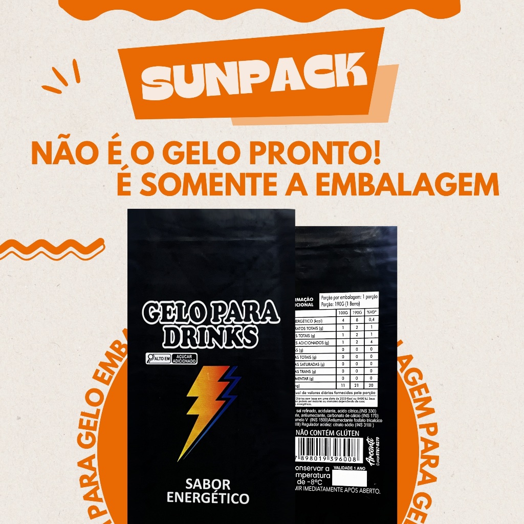 EMBALAGEM PARA GELO SABORIZADO SE TRATA APENAS DA EMBALAGEM, NÃO É O GELO PRONTO! EMBALAGEM PARA FABRICAÇÃO DE GELOS SABORIZADOS. Embalagem para Gelo Sabor/Modelo: Sabor Energético Quantidade: 250 Unidades Medidas: Largura: 9 cm Altura: 20 cm Peso líquido: até 190 ml ou 200 gramas Informações técnicas: Material: PEROLIZADO Contém código de barras Contém informações nutricionais Contém ingredientes de fabricação PERGUNTAS FREQUENTES: Posso colocar a mistura para gelo dentro da embalagem? - NÃO! NÃO COLOQUE LÍQUIDOS DENTRO DO SAQUINHO, O GELO DEVE ESTAR PRONTO PARA CONSUMO ANTES DE SER EMBALADO! Eu preciso de mais alguma coisa para fazer meus gelos? - SIM! VOCÊ PRECISARÁ DE ÁGUA, FORMA PARA GELO E MISTURA SABORIZANTE PARA GELO Como eu lacro as embalagens após colocar o gelo dentro? - VOCÊ PRECISARÁ DE UMA SELADORA PARA PLÁSTICOS. VOCÊ ENCONTRA COM FACILIDADE NO MERCADO LIVRE.
