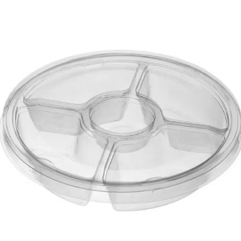 EMBALAGEM PETISQUEIRA GALVANOTEK G540 (25 UNIDADES.) Embalagem bandeja petisqueira com 4 divisórias laterais e 1 central 400ml Externas: 19,8cm de diâmetro 4cm de altura Fondue, petiscos, castanhas, frutas secas, salgados
