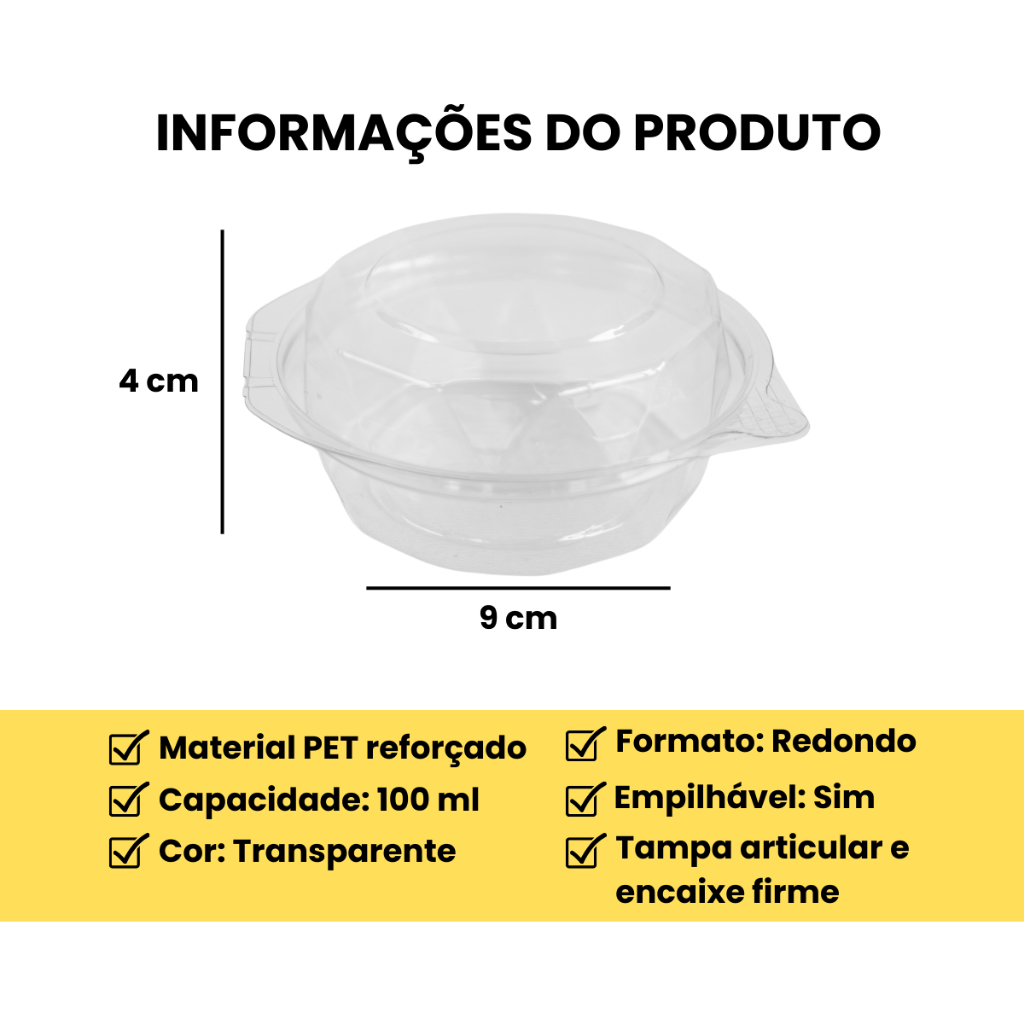 Potes práticos e resistentes, ideais para mini sobremesas, mousses, pavês, brigadeiros e degustações. O design ranhurado ou diamantado dá um acabamento elegante e valoriza a apresentação do produto, perfeito para vendas. Benefícios: • 120ml na medida certa: ideal para porções individuais e kits degustação. • Formato redondo: fácil de armazenar e empilhar, ocupando menos espaço. • Visual premium e proteção extra no transporte. • Material resistente: evita vazamentos e mantém o doce fresquinho. • Transparente: deixa o produto mais chamativo para o cliente. Situações do dia a dia: • Produção e venda de mini doces, mousses, pavês e sobremesas geladas. • Kits festa, lembrancinhas e degustações. • Delivery de confeitaria e marmitinhas doces. • Organização da geladeira com porções individuais. • Lanches rápidos para trabalho, escola ou academia. INFORMAÇÕES TÉCNICAS: Marca: Ecoplast (Copoplast) Ref.: Eco-642 Cor: Transparente Material: PET (Polietileno Tereftalato) Altura: 4cm Largura: 9cm Comprimento: 9cm Capacidade: 100ml