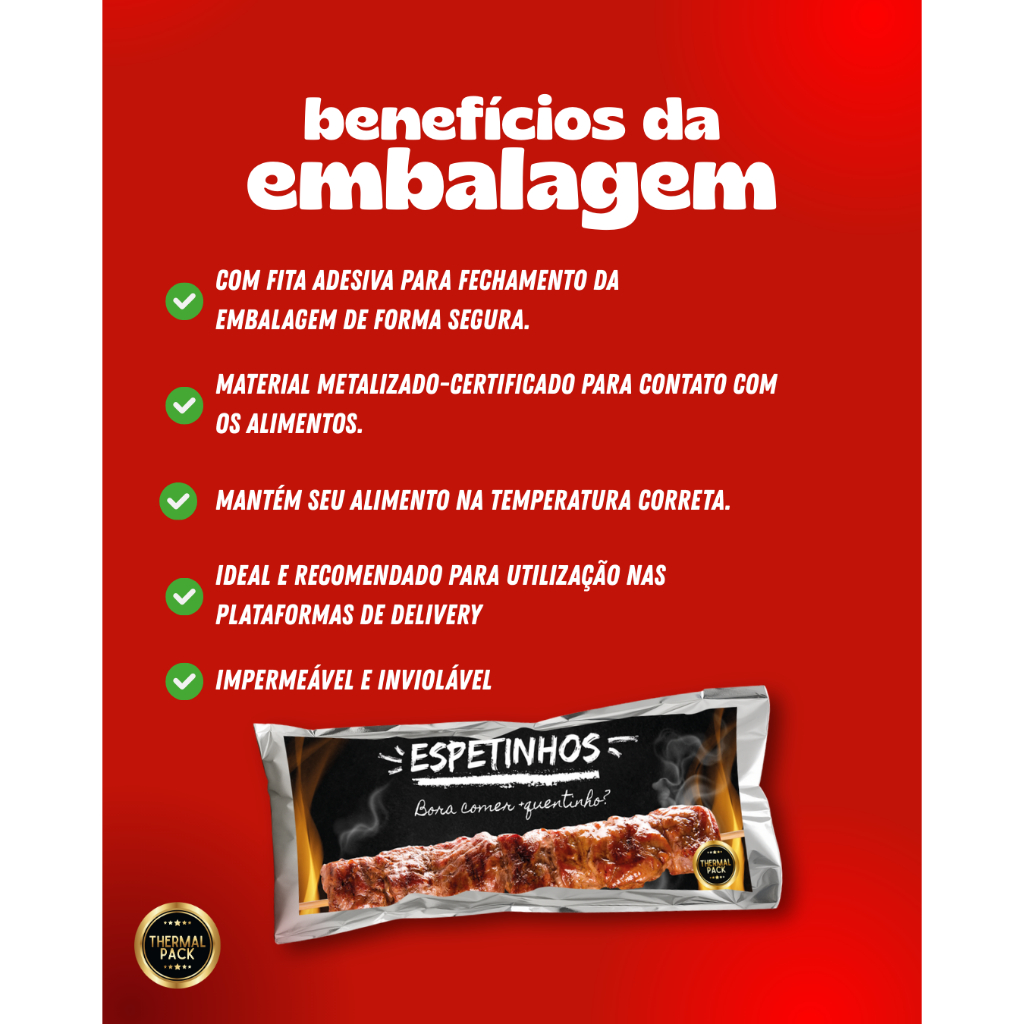 MANTÉM O ALIMENTO QUENTE EM MÉDIA 40 MINUTOS APÓS EMBALADO É fato que o alimento vai perdendo calor este produto oferece condições adequadas de higiene e transporte fazendo com que o alimento chegue quentinho e suculento até a mesa do consumidor. Introduza esta embalagem INOVADORA que com certeza vai diferenciar seu produto, FIDELIZANDO seus clientes. PONTOS POSITIVOS; - Tamanho: Tamanho 35cm x 13cm - Resistente: cabem em média 6 espetinhos - Prática: Aba com película adesiva, Selagem perfeita - Higiênica: Material próprio para alimentos - Moderna e Bonita: Agrega valor ao seu produto - Chamativa: Gera publicidade espontânea para o seu negocio 1 pacote com 100 saquinhos