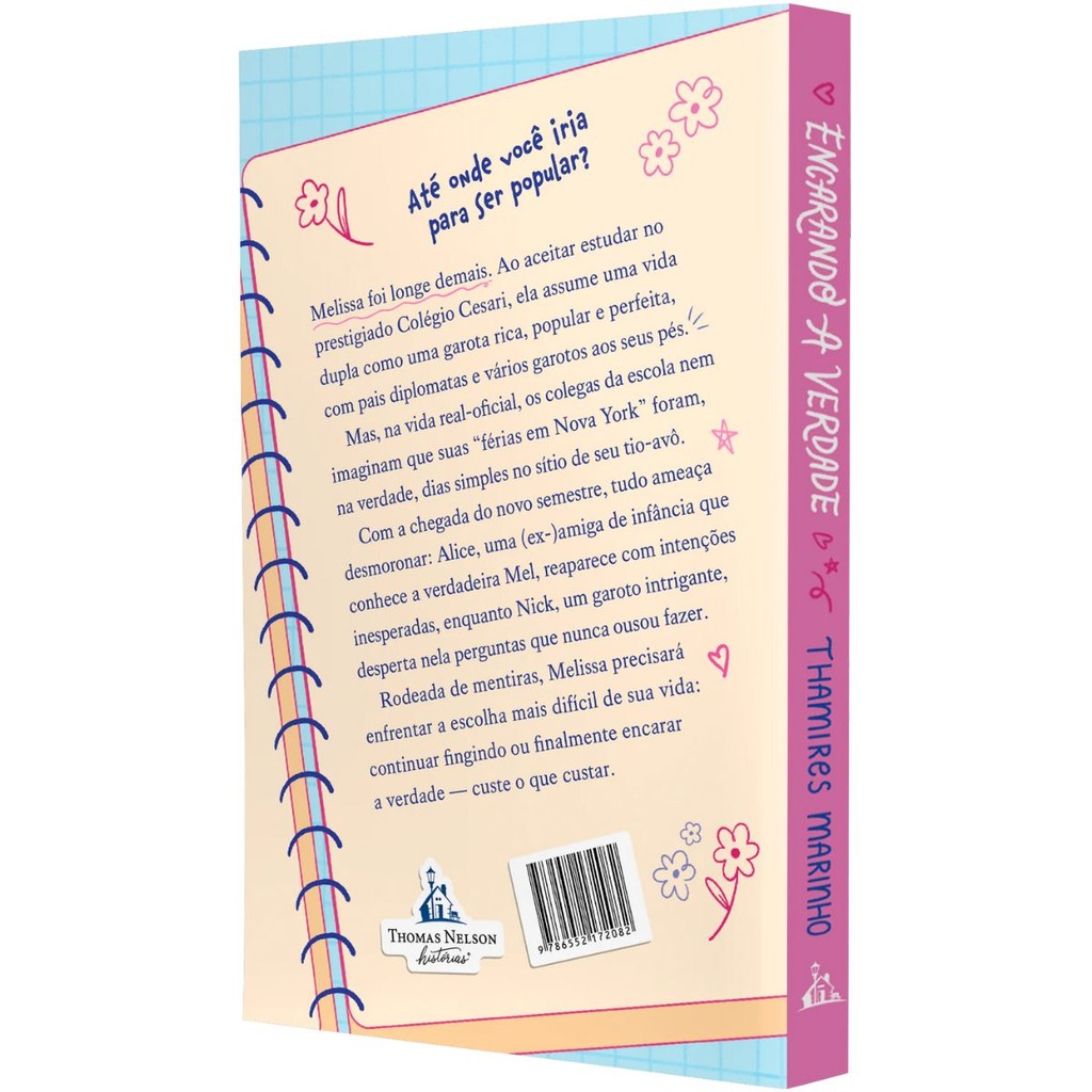Encarando a verdade | Thamires Marinho Até onde você iria para ser popular? Melissa foi longe demais. Ao aceitar estudar no prestigiado Colégio Cesari, ela assume uma vida dupla como uma garota rica, popular e perfeita, com pais diplomatas e vários garotos aos seus pés. Mas, na vida real-oficial, a turma da escola nem imagina que suas “férias em Nova York” foram, na verdade, dias simples com seus parentes no interior. Com a chegada do novo semestre, tudo ameaça desmoronar: Alice, uma (ex-)amiga de infância que conhece a verdadeira Mel, reaparece com intenções inesperadas, enquanto Nick, um garoto intrigante, desperta nela perguntas que nunca ousou fazer. Rodeada de mentiras, Melissa precisará enfrentar a escolha mais difícil de sua vida: continuar fugindo ou finalmente encarar a verdade custe o que custar. Autor: Thamires Marinho Editora: Thomas Nelson Brasil Acabamento: Capa comum brochura Dimensões: 14 cm larg. x 21 cm alt. Número de páginas: 240